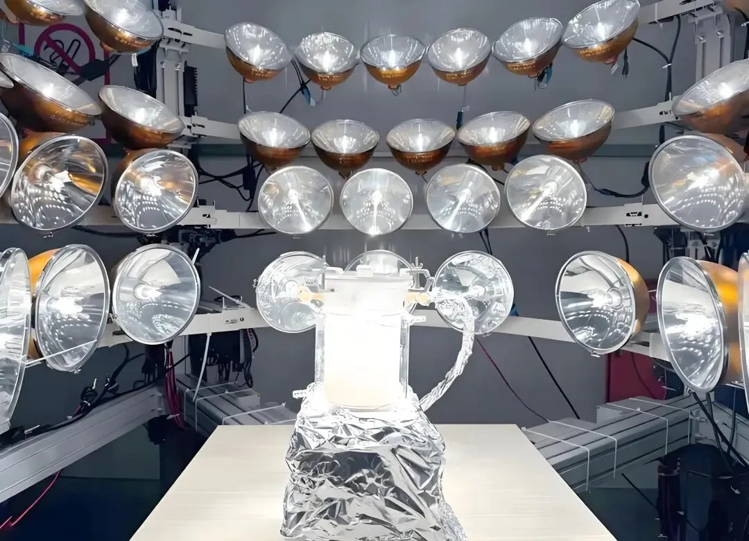 第一阶段的研究与开发工作在实验室完成,团队通过系统性地反复试验,实现了核心材料合成技术的验证与迭代优化。历经多轮制备工艺的探索与参数调整,成功合成出具有特定形貌与高催化活性的二十六面体钛酸锶,完成了钛酸锶从“六面体”到“多面体”这场材料学的革命。在此基础上,团队依托自主设计与搭建的专用实验仪器与测试设备,构建了完整的聚光催化反应测试平台,开展了系列的聚光性能试验,全面验证并打通了从光能捕获、催化反应到氢气析出的全流程工艺路线,为该技术路径奠定了坚实的技术可行性基础。
