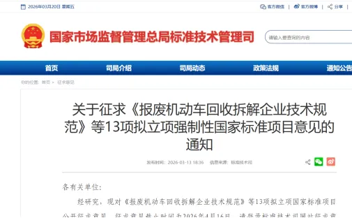 国家市场监管总局标准技术司发布通知,就《报废机动车回收拆解企业技术规范》等 13 项拟立项强制性国家标准公开征求意见(截止 2026 年 4 月 16 日),该标准由商务部提出、中国汽车技术研究中心有限公司起草,聚焦报废机动车及拆解产物(含动力蓄电池、各类油液、金属等)的,明确回收贮存、拆解预处理、污染控制、安全管理等关键环节技术要求,旨在保障作业人员生命安全与职业健康、防范环境风险、促进关键战略资源循环利用及维护市场公平,核心技术内容包括增设燃料电池汽车拆解要求、细化电动汽车拆解安全规范、优化地区分档与功能分区、规范分支机构管理及引导精细化拆解,强制理由为保障生态环境安全。(来源:国家市场监督管理总局)