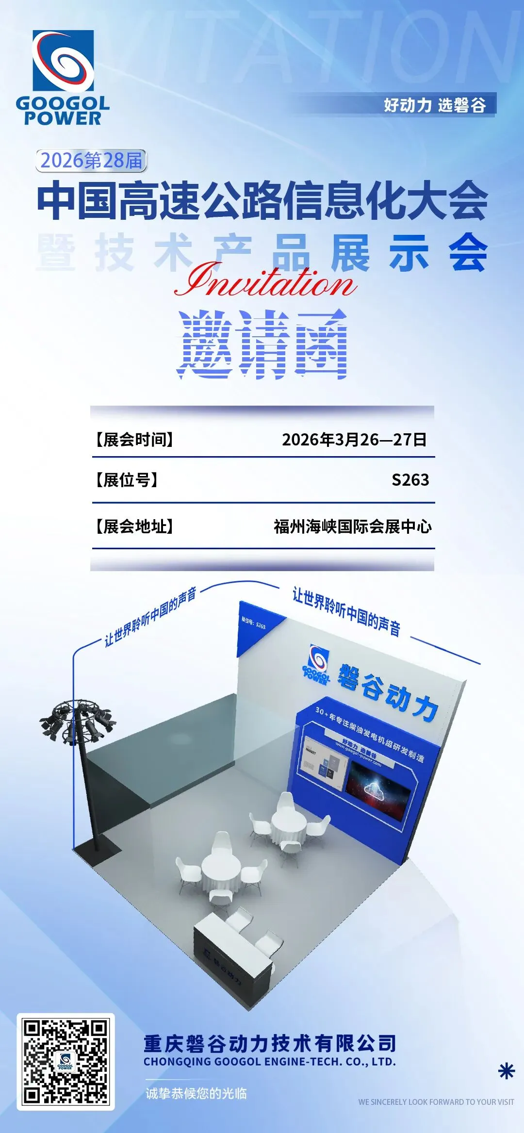 3月26-27日,第二十八届高速公路信息化大会暨技术产品博览会将在福州海峡国际会展中心举行,磐谷将在S263展位展出一台适用大交通应用场景的磐谷电力机组,并携手合作伙伴提供落地方案,诚邀您共襄盛会。