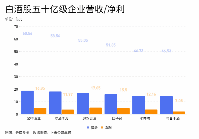 另外,水井坊和老白干酒也分别以46.73亿元和46.53亿元的营收,距50亿营收一步之遥。