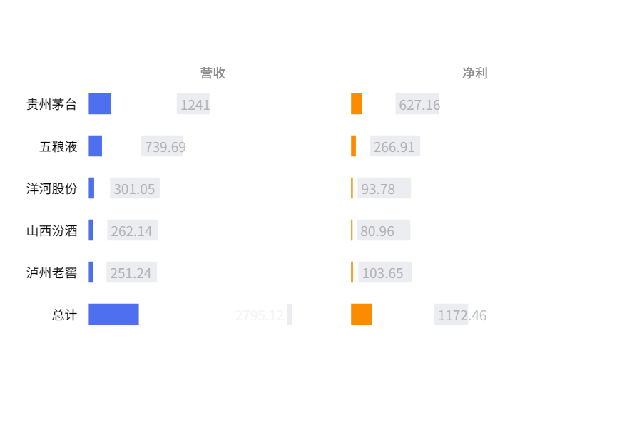 从营收以及利润的整体表现来看,增长仍然是行业主旋律。白酒行业前五营收已达2829.66亿元,占规上白酒企业营收的42.70%;净利润已达1172.46亿元,占规上白酒企业利润的53.25%。