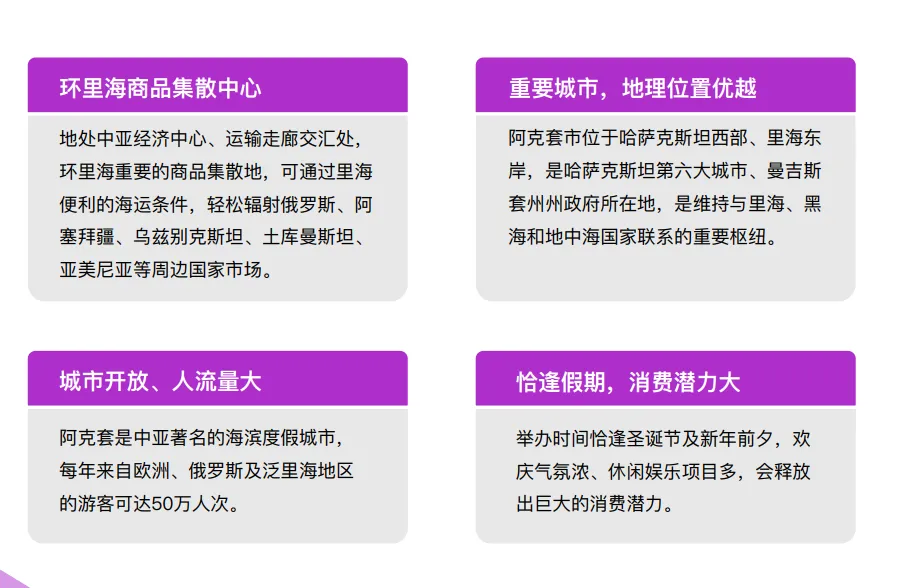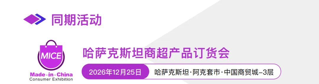 哈萨克斯坦一中国消费品博览会是中国消费品亮相中亚核心市场的年度盛会。本届博览会将于2026年12月24日至27日,在哈萨克斯坦重要港口城市阿克套隆重举办,旨在打造集“展览展示、品牌推介、产销对接、项目洽谈”于一体的全链条服务平台。本次博览会的最大亮点在于首创“一次参展,全年卖货”模式一-展会结束后,参展商可将商品留存在展馆进行为期一年的长期展销,持续对接采购商与消费者,实现全年不间断的曝光与交易。博览会将汇集约200家来自中国各地的优秀消费品生产、贸易及零售企业,预计吸引30000名专业批发商(B端)及终端消费者(C端)到场参观、洽谈与采购。二:参展范围