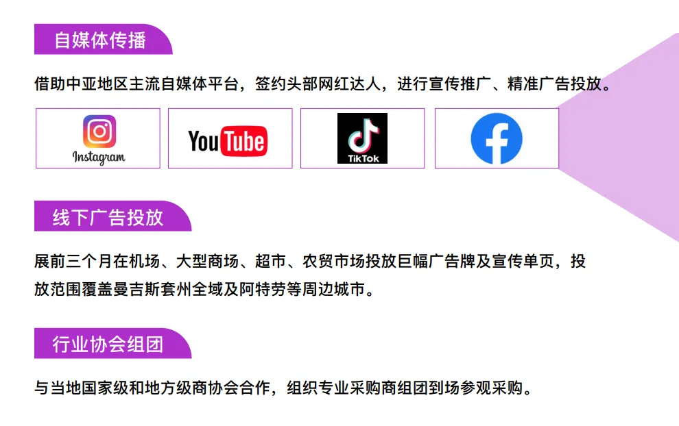 哈萨克斯坦商超产品订货会是博览会同期举办的核心专场活动,旨在为中国供应商与哈萨克斯坦大型采购商搭建一个精准、高效、深度的对接平台。订货会设在展馆三层,为独立封闭的专场区域,营造专注、专业的洽谈环境。定向邀请超过35家哈萨克斯坦极具实力的大型商场、连锁超市、批发市场、二手车、摩托车经销商及品牌代理商携明确采购需求莅临现场。每家采购商均设有专属洽谈位,供应商可根据自身产品类别与合作意向,主动选择目标采购商,进行一对一、面对面的深度交流与需求匹配。这不仅是一个展示产品的窗口,更是一个直接锁定订单、建立长期合作关系的绝佳机会。四:展馆设置