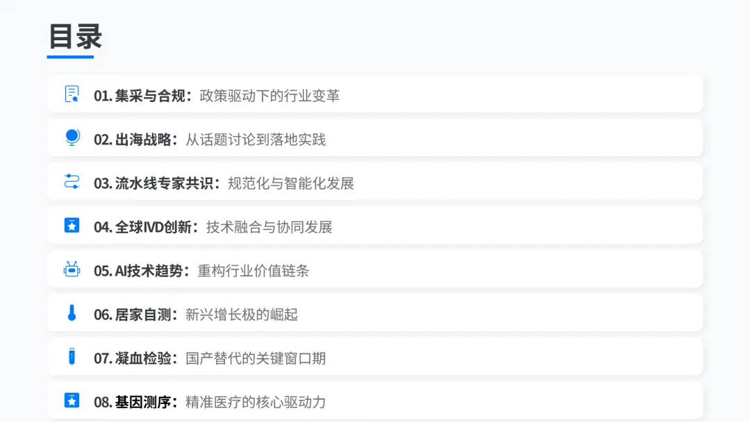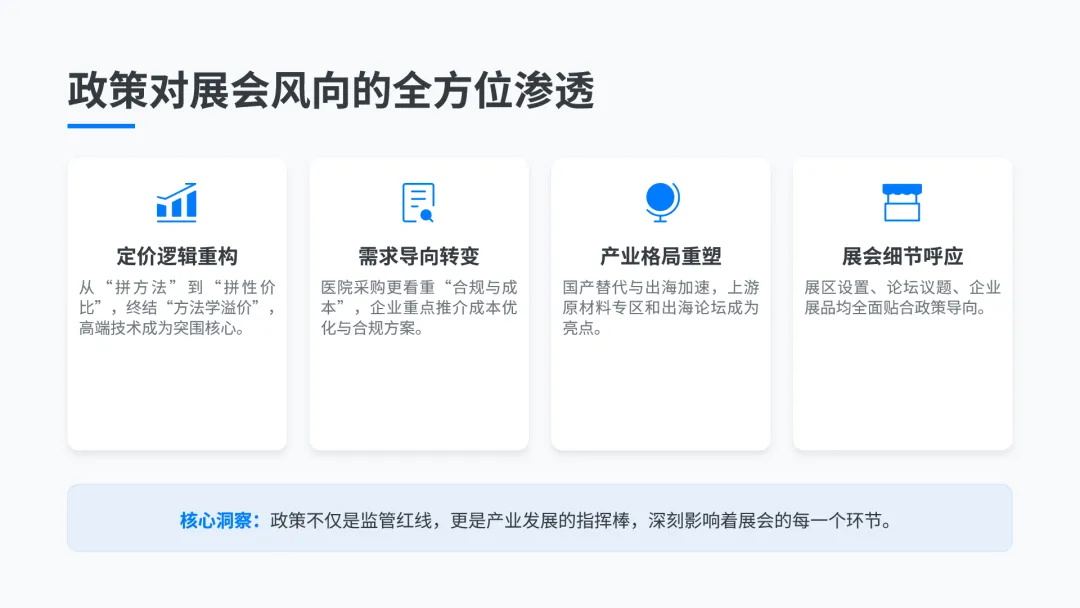 政策的核心变革全面渗透到展会的展区设置、展品趋势和论坛议题中,核心体现在四大维度:定价逻辑重构,指南终结“方法学溢价”,实现“同果同价”,仅质谱、测序等高技术壁垒技术可申请加收,AI辅助诊断不加价,展会现场高效小型化的自动化设备成为热门,质谱、数字PCR、mNGS等高端技术成为企业突围核心赛道,AI从“主打溢价”转变为“标配效率工具”;需求导向转变,指南明确检验项目实行“技耗合一”,与医保飞检、DRG/DIP深度联动,倒逼检验科从“创收单元”转变为“成本管控单元”,展会中企业不再单纯展示产品参数,重点推介成本优化、合规申报、质控体系建设等适配方案,精准对接医院新需求;产业格局重塑,价格管控趋严背景下,“国产替代、供应链自主可控”成为行业共识,展会专门设置IVD上游原材料专区,集中展示国产核心原料与部件的技术突破,同时国内政策趋严推动企业加速出海,展会同期举办多场出海相关论坛与对接活动;展会细节也全面呼应政策导向,静音馆、实验室智能化展区、居家检测生态街区均贴合指南“提质增效、便捷化”要求,论坛议题全部围绕指南落地展开,企业展品也同步贴合政策,如德米特推出的全流程自动化质谱产品,同时契合“高效低成本”与高端技术加收的双重导向。