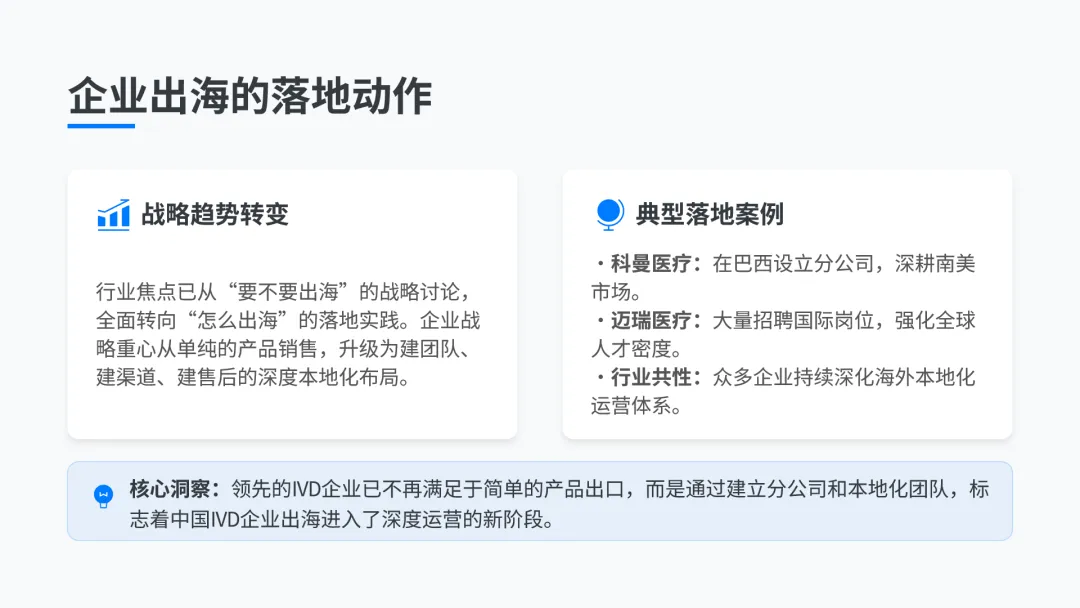 目前行业已从“要不要出海”的讨论,全面转向“怎么出海”的落地实践,从单纯的产品销售,转向建团队、建渠道、建售后的深度本地化布局,典型案例包括科曼在巴西设立分公司,迈瑞医疗大量招聘国际岗位,即便欧美市场准入门槛高、亚非拉市场竞争激烈,仍有大量企业持续深化海外本地化布局。