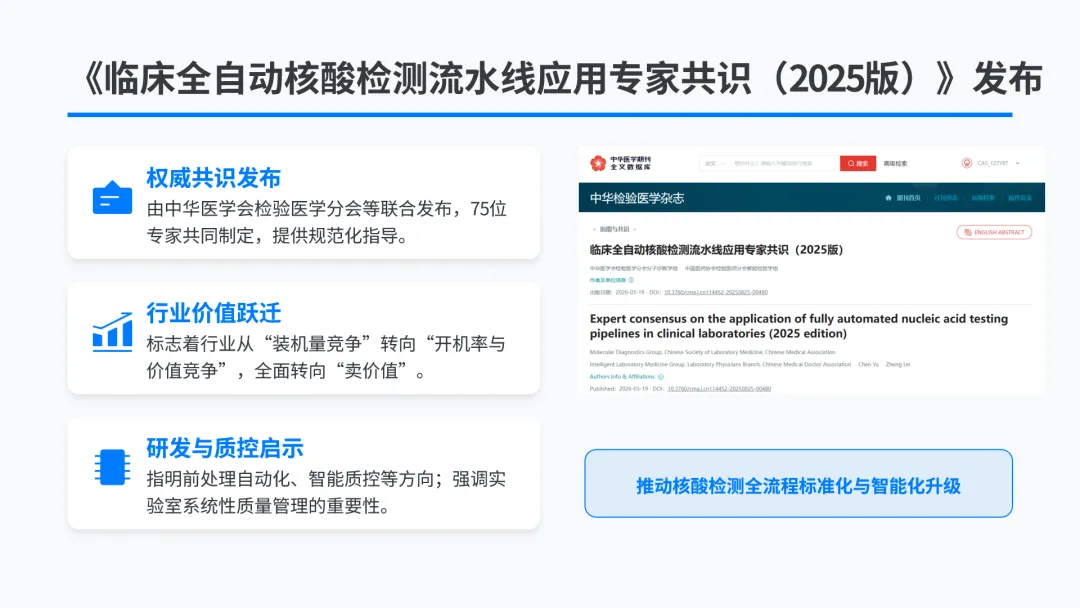 IVD流水线行业已从“装机量竞争”转向“开机率与价值竞争”,行业从“卖设备”全面转向“卖价值”,本次展会既有《临床全自动核酸检测流水线应用专家共识(2025版)》的权威发布,也有多家企业的流水线新品集中亮相,全面呈现了行业的规范化、智能化发展趋势。该共识由中华医学会检验医学分会分子诊断学组、中国医师协会检验医师分会智能检验学组联合发布,由全国25个省区市62家医疗机构的75位专家共同制定,为国内尚处起步阶段的全自动核酸检测流水线应用提供了规范化指导,核心要点包括:场地要求有条件放宽但底线清晰,核酸检测流水线宜放置于有通风条件的独立区域或标本制备区,通过生物安全风险和核酸污染风险评估后,可放置在非独立场所,不强制要求传统基因扩增实验室的四区分隔,但需提交实质性的安全性证明;自动化并未降低人员资质要求,流水线操作人员需持有临床基因扩增检验实验室技术人员上岗证,经严格的仪器操作培训和考核后方可上岗,对用人单位的培训和考核机制提出了更高要求;非液体样本仍是样本前处理的技术瓶颈,实验室应选择适配流水线的样本采集容器,流水线需具备适配能力,非液体样本需进行充分均质化处理,实验室需制定专门的前处理SOP,目前自动化尚未完全覆盖所有样本类型;智能质控是发展方向但尚未成为标配,流水线需符合临床分子诊断实验室质控体系要求,可根据不同检测模式建立对应质控规则,宜配备智能质控系统,但目前该类系统尚未普及,初期仍需人工复核;防污染设计需兼顾设备内在安全性与实验室管理,设备内需配备必要的防污染装置,实验室应制定污染预防、监测和处理SOP并持续改进,定期开展擦拭试验,及时发现高风险点位;结果自动分析仍需人工把关,实验室需制定结果报告与不确定结果复检SOP,谨慎使用系统自动分析的结果,尤其是早期使用阶段必须进行人工审核,不确定结果需启动复检程序。该共识也为行业指明了方向,对IVD企业,前处理自动化、智能质控临床验证、设备生物安全设计是核心研发方向;对临床实验室,自动化程度越高,系统性的质量管理越不能放松。