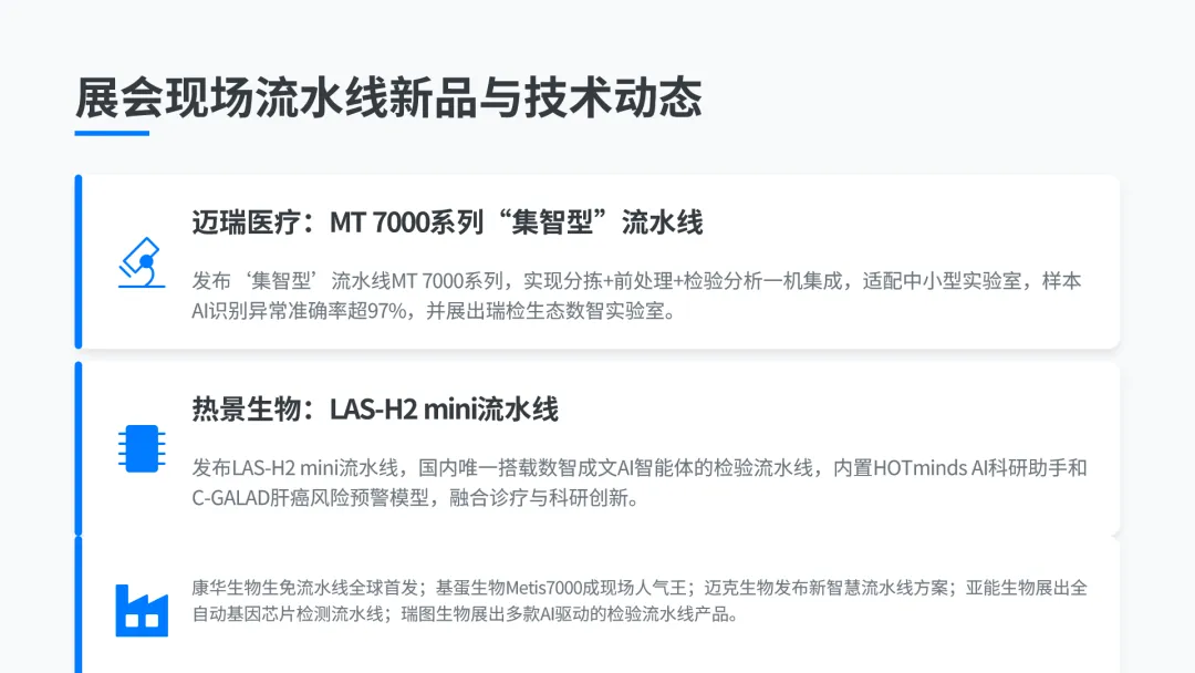 展会现场多款流水线新品集中亮相,迈瑞医疗发布“集智型”流水线MT 7000系列,实现分拣+前处理+检验分析一机集成,适配中小型实验室需求,每小时可处理800管样本,采用10合1设计,将手工17步操作缩减为4步,提升76%的操作效率,样本AI识别异常准确率超97%,可自动判断异常样本的处理方案,同时展出瑞检生态数智实验室,实现从“人等数据”到“数据智理”的升级;热景生物发布LAS-H2 mini流水线,是国内唯一搭载数智成文AI智能体的临床检验流水线,内置HOTminds AI科研助手,提供从文献调研、方案设计到报告撰写的一站式科研辅助,同时内置C-GALAD肝癌风险预警模型,实现常规诊疗与科研创新的深度融合;此外,康华生物生免流水线全球首发,基蛋生物Metis7000成为现场人气王,迈克生物发布新智慧流水线方案,适配检验结果互认需求,亚能生物展出全自动基因芯片检测流水线,打造全场景智慧化分子诊断实验室,瑞图生物主推推染阅片血球流水线,展出多款AI驱动的检验流水线产品。