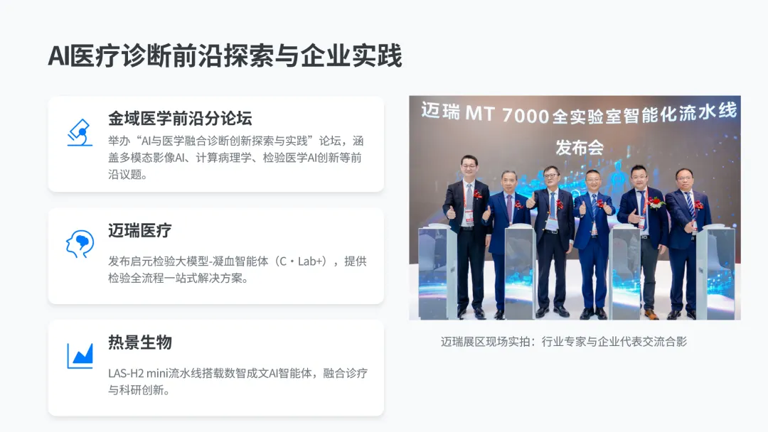 金域医学于3月21日举办AI医疗诊断前沿分论坛,围绕“AI 与医学融合诊断创新探索与实践”展开,涵盖多模态影像AI、肺癌分子检测AI、阴道微生态AI诊断、计算病理学、检验医学AI创新、免疫固定电泳AI应用、细胞检测AI技术等前沿议题,多位行业专家分享了AI在医疗诊断领域的实践成果与创新方向。企业端的AI落地成果同样丰富,迈瑞医疗发布启元检验大模型-凝血智能体(C·Lab+),打造开单、分析、监控、解读、审核一站式解决方案,贯穿检验全流程,解决凝血项目开单难、解读审核难的行业痛点,同时展出多款搭载AI技术的流水线与设备,展示了AI在医疗机构的成熟落地应用案例;热景生物LAS-H2 mini流水线搭载的数智成文AI智能体,实现临床诊疗与科研创新的深度融合,为实验室提供全流程智能化服务;医智锐科技在基层分论坛发布“数据底座+智能引擎+运营闭环”基层AI慢病管理新范式,打造一站式AI慢病管理解决方案,破解基层人力不足、数据孤岛、管理脱节等痛点,该方案已落地全国50+区县、800+基层医疗机构,累计服务慢病患者超600万人,将基层医生慢病管理耗时减少40%,规范随访率超89%;瑞图生物依托自主研发的Deepcell人工智能引擎,打造多款AI驱动的检验流水线,在AI视觉、AI识别领域持续突破,是国内极少数先天带有AI基因的IVD企业。