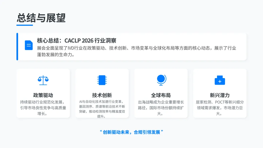 本次第二十三届CACLP展会,恰逢检验医疗服务价格政策发布的关键节点,政策与产业深度同频,全面呈现了IVD行业从规模扩张向质量提升、从国内竞争向全球布局、从产品销售向价值创造的转型趋势。集采与合规重构了行业的底层逻辑,国产替代与出海成为行业发展的双主线,智能化、集成化、精准化成为技术创新的核心方向。从中心实验室到基层医疗,从院内检测到居家自测,从疾病诊断到健康管理,IVD行业正在全方位升级,国产企业的创新能力持续提升,在多个前沿领域实现突破,将推动我国IVD产业实现高质量发展,助力健康中国建设。