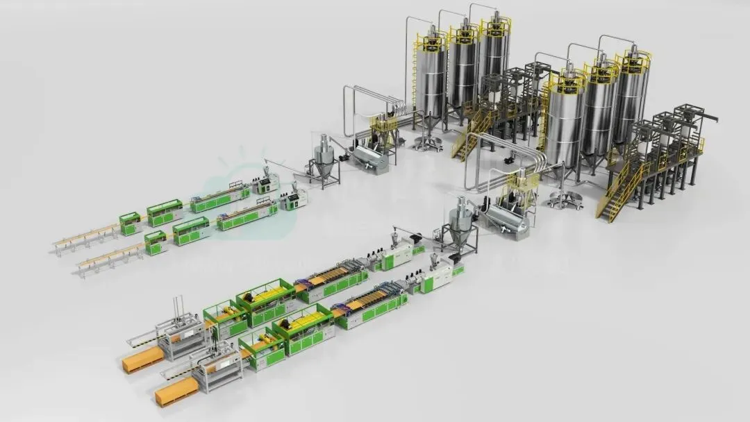 动画开篇,从源头还原原料自动化供给体系,完美呈现大料仓、吨包供料、缓存料仓、小料配方四大核心模块的协同运作。超大容量大料仓实现原料批量存储,满足连续生产需求;吨包供料系统高效转运大宗原料,省去人工搬运繁琐,提升上料效率;缓存料仓平稳过渡原料输送,保障供料不间断、不拥堵;小料配方环节精准计量、均匀混合,严格把控原料配比精度,从源头杜绝原料误差,为门板的均匀质感、稳定性能打下坚实基础,全程自动化闭环,无粉尘泄露,环保又高效。
