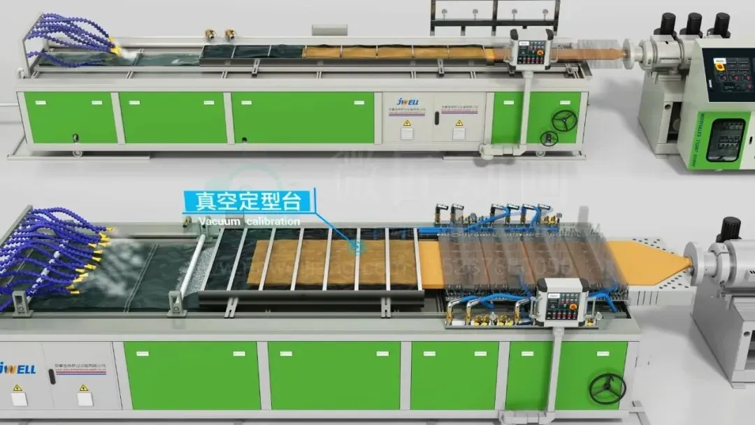 进入核心挤出工序,动画重点聚焦锥形双螺杆挤出机、双螺杆挤出机的硬核性能,动态展示螺杆高速运转、原料充分塑化的全过程。锥形双螺杆挤出机适配PVC/WPC原料特性,塑化均匀、剪切温和,避免原料过热降解,保障门板基材细腻无杂质;配套双螺杆挤出机协同发力,出料稳定、压力均匀,实现门板连续匀速挤出,厚度均匀、平整度高。动画清晰呈现螺杆结构、出料状态,直观展现设备高扭矩、低能耗、高产量的核心优势,打破传统工业设备“只可远观”的局限,让核心技术看得见、摸得着。