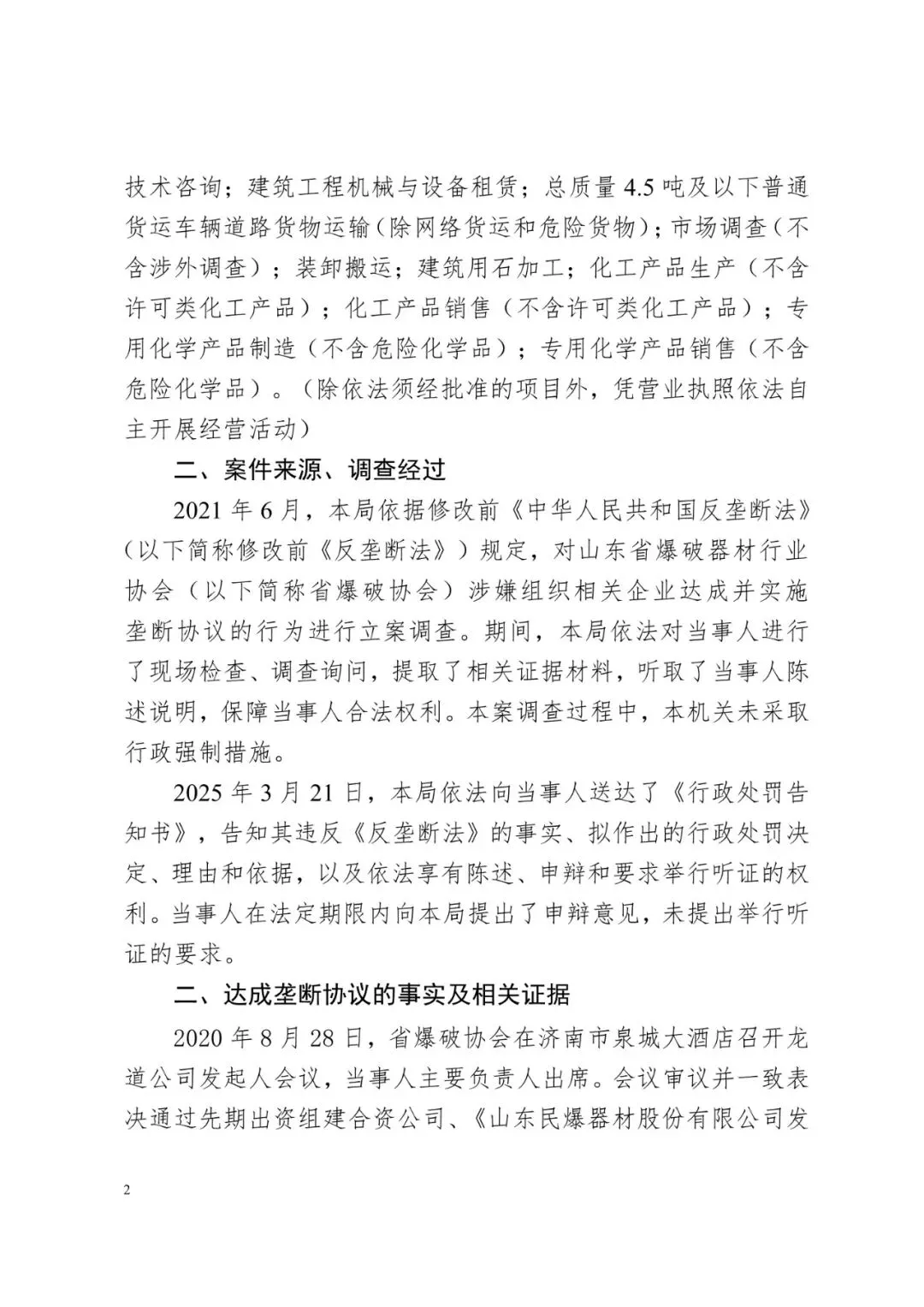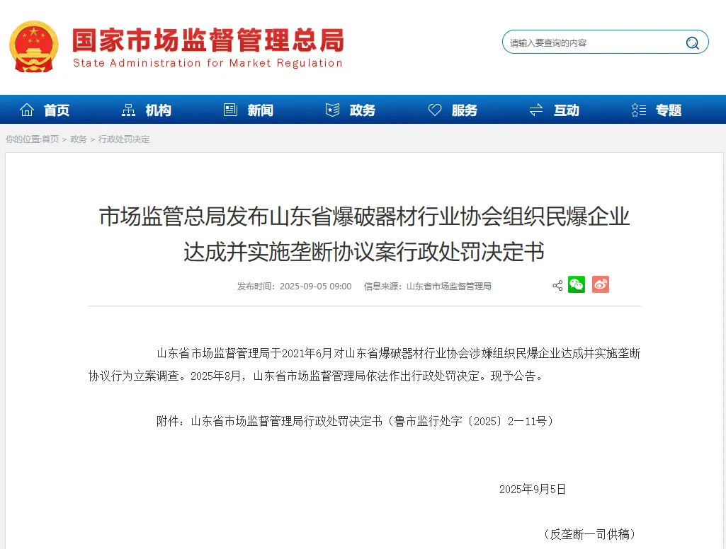 山东省市场监督管理局于2021年6月对山东省爆破器材行业协会涉嫌组织民爆企业达成并实施垄断协议行为立案调查。2025年8月,山东省市场监督管理局依法作出行政处罚决定。现予公告。