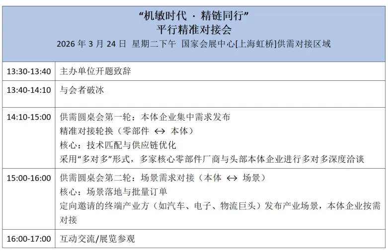 十大零部件巨头“转型实战”首次集中披露,三花、双环等巨头亲述他们的选择与教训。平行精准对接会搭建"供需直连、深度对话、精准匹配"桥梁,解决新兴需求传统供应链难以匹配与传统企业具备供应能力,但难以接触采购订单的供需矛盾。