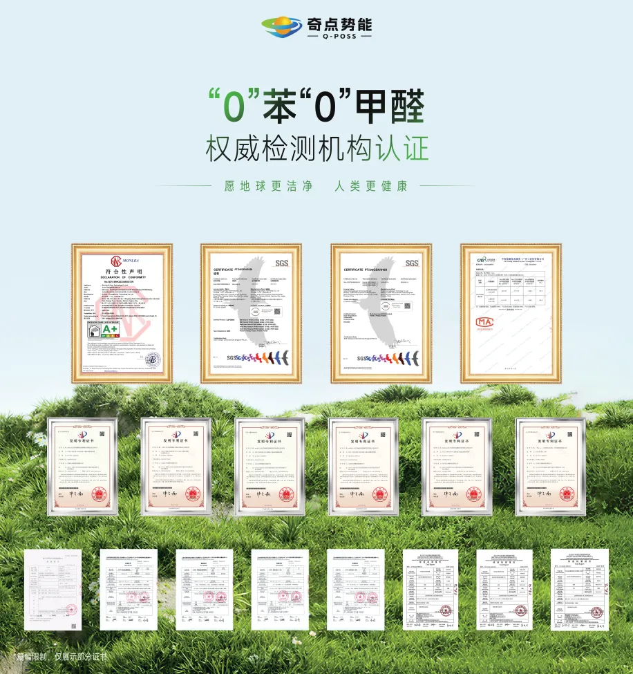 POSS结构源自美国空军实验室的航空材料研究,奇点势能首次将其规模化应用于木器涂装领域合成生产Q-POSS涂层水性漆,实现了“0”苯“0”甲醛的环保突破(SGS认证、法国A+认证),同时保持了优异的物理性能和施工便捷性。目前公司已申请专利33项,参与2项国家标准制定,获评高新技术企业、科技型及创新型中小企业。