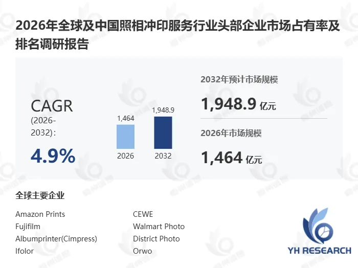 根据YH恒州诚思信息咨询调研统计,2025年全球照相冲印服务市场规模约1398.6亿元,预计未来将持续保持平稳增长的态势,到2032年市场规模将接近1948.7亿元,未来六年CAGR为4.9%。