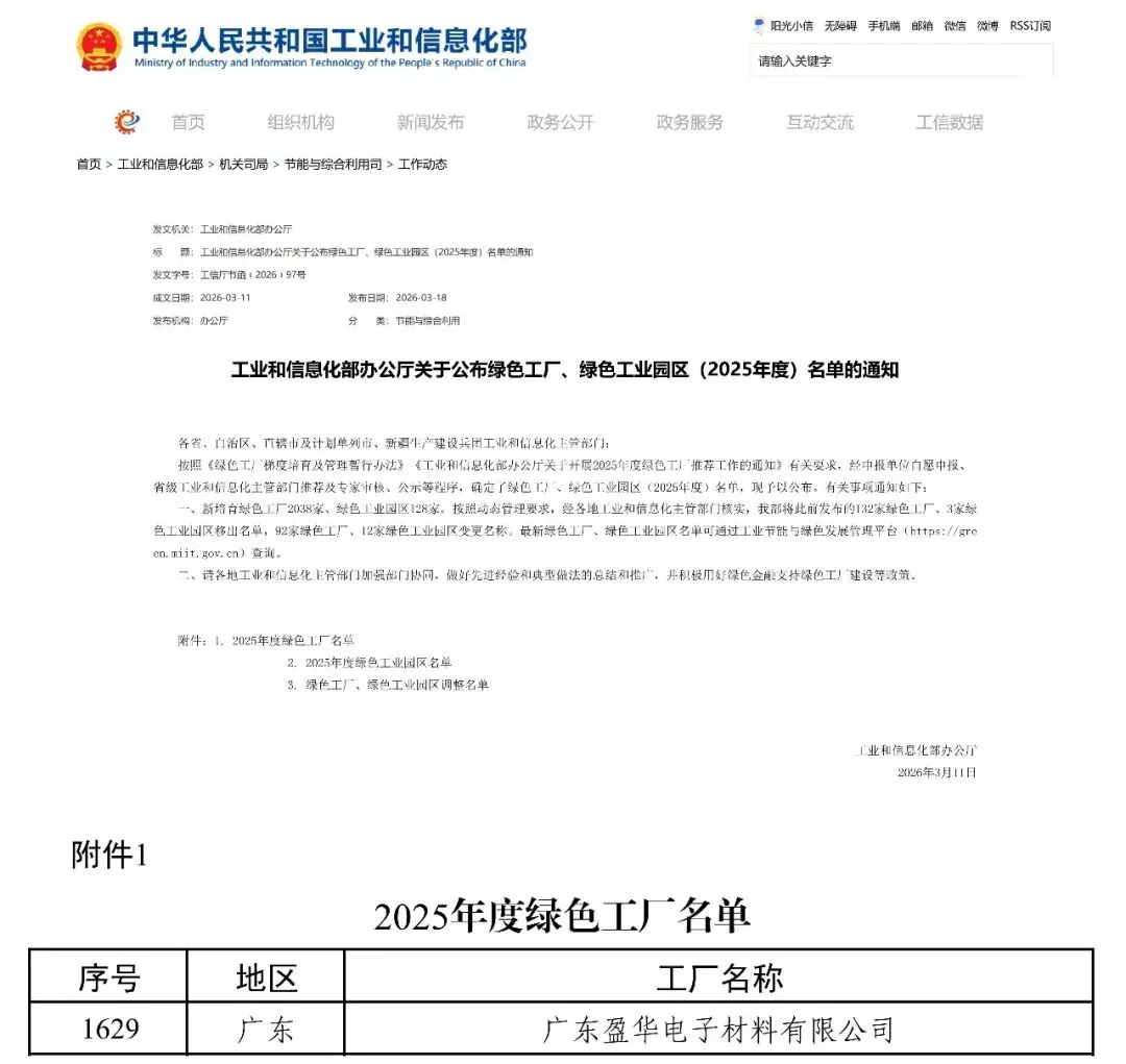 近日,国家工业和信息化部正式公布了《绿色工厂、绿色工业园区(2025年度)名单》,盈华材料凭借在绿色低碳、清洁生产、节能减排、可持续发展等方面的优秀表现,成为了广东省梅州市平远县首家成功获得“国家级绿色工厂”认证的企业!