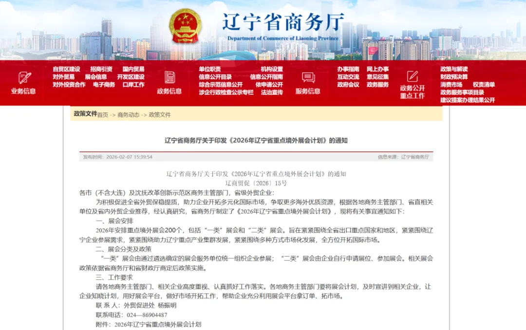 《辽宁省商务厅关于印发〈2026年辽宁省重点境外展会计划〉的通知》,明确2026年辽宁省共安排200个重点境外展会,分为一类展会和二类展会,“一类”展会由通过遴选确定的展会服务单位统一组织企业参展;“二类”展会由企业自行申请展位、参加展会,明确了两类展会的补贴适用范围,企业可按政策享受补贴。