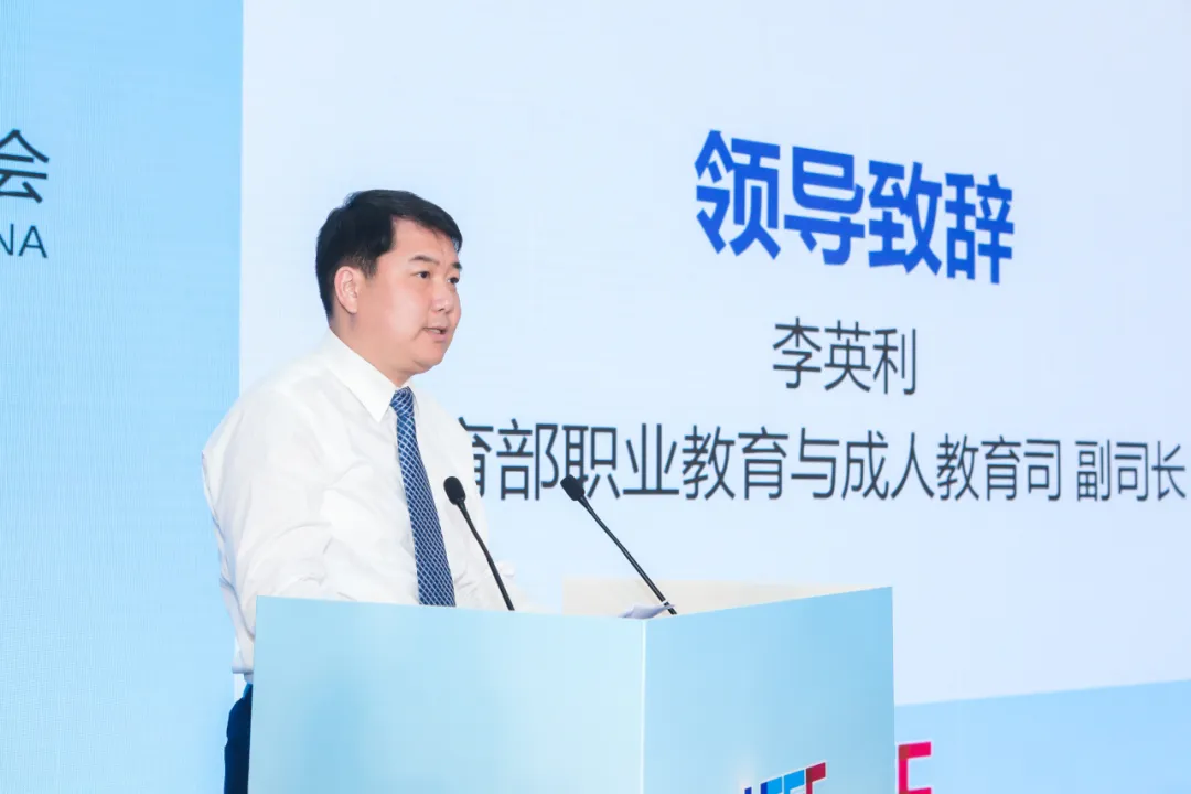 李英利致辞,他围绕数字化赋能职业教育高质量发展谈几点意见:一是提高认识,着力构建数字时代职业教育新形态。二是总结经验,探索数字赋能职业教育高质量发展新路径。三是稳扎稳打,纵深推进职业教育数字化扩优提质。四是提升数字化基础设施建设质量等标准,整体改善职业院校数字化环境。