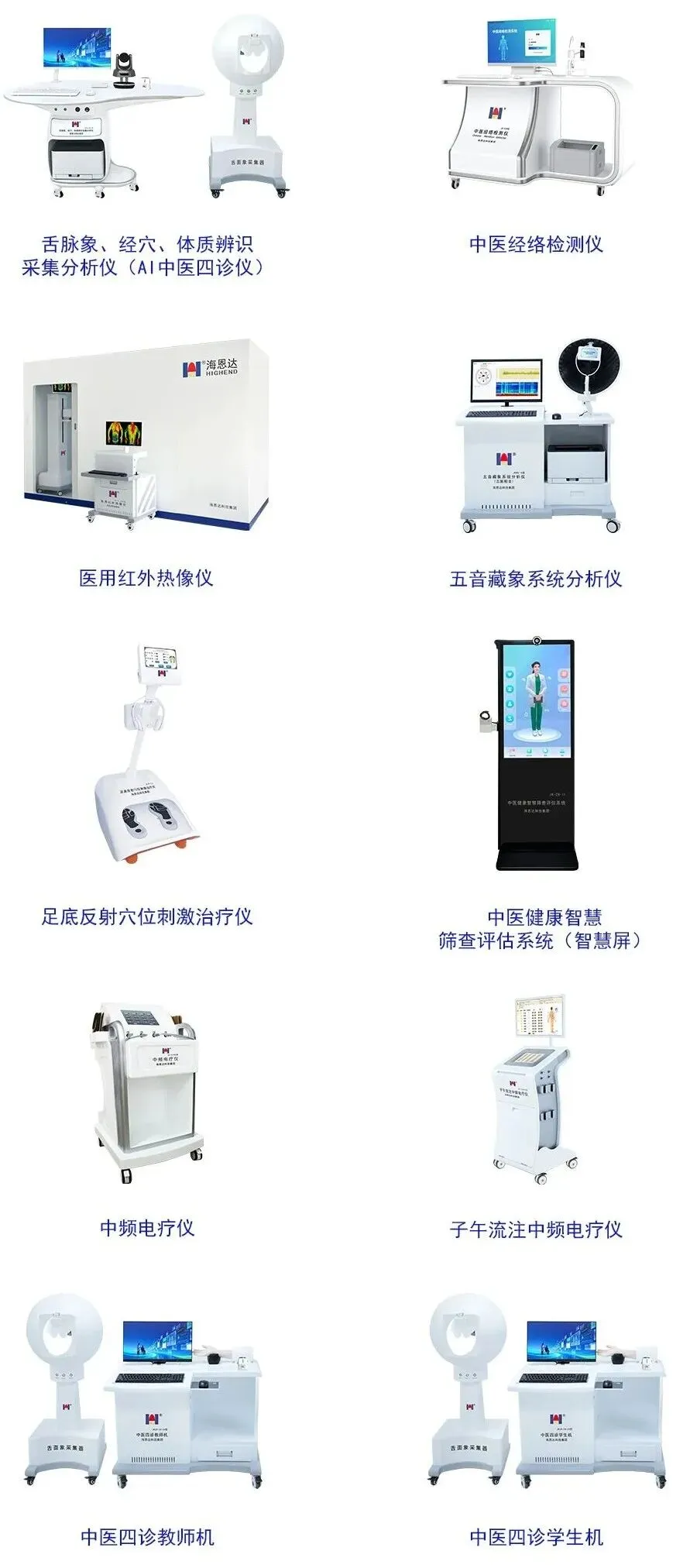 从可实现舌脉象、经穴、体质一体化辨识的AI中医四诊仪,到中医经络检测仪、医用红外热像仪、五音藏象系统分析仪等特色诊断设备,再到中频电疗仪、足底反射穴位刺激治疗仪等康复理疗设备,以及专为中医药院校打造的中医四诊教学机、学生机,完整呈现了海恩达在中医数字化诊疗领域的全链条产品布局。