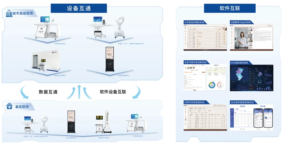 软件端,依托AI中医数据驾驶舱、AI中医辅助问诊系统、共享中药房系统、名老中医传承创新系统、中医治未病(慢病)管理系统、远程教育与会诊系统,既以 AI 模拟中医诊疗思维提供全流程诊疗支持,又通过数字化手段打通 “学 - 研 - 用” 链路,助力经验传承,同时优化基层中药服务与健康管理模式,最终赋能中医医联体/医共体及智慧科室建设,实现多方共赢。