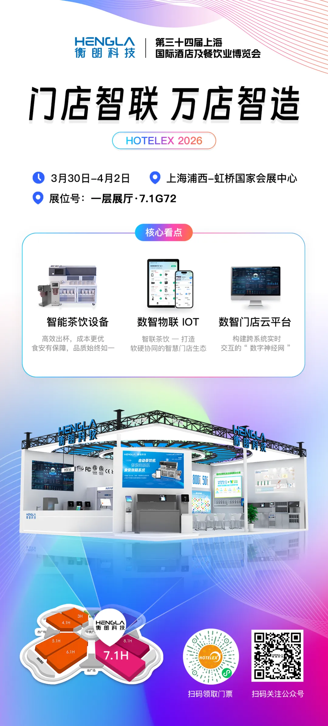作为国内领先的门店数智化解决方案服务商,衡朗科技将携数智物联 IOT 平台、自动茶饮机、食安效期管理系统、智能泡茶机、茶咖机、数智信发、数智门店云平台亮相,以软硬件一体化的核心实力,为餐饮品牌打造从出品到管理的数智化升级全方案,邀您共探餐饮行业数智化新未来!