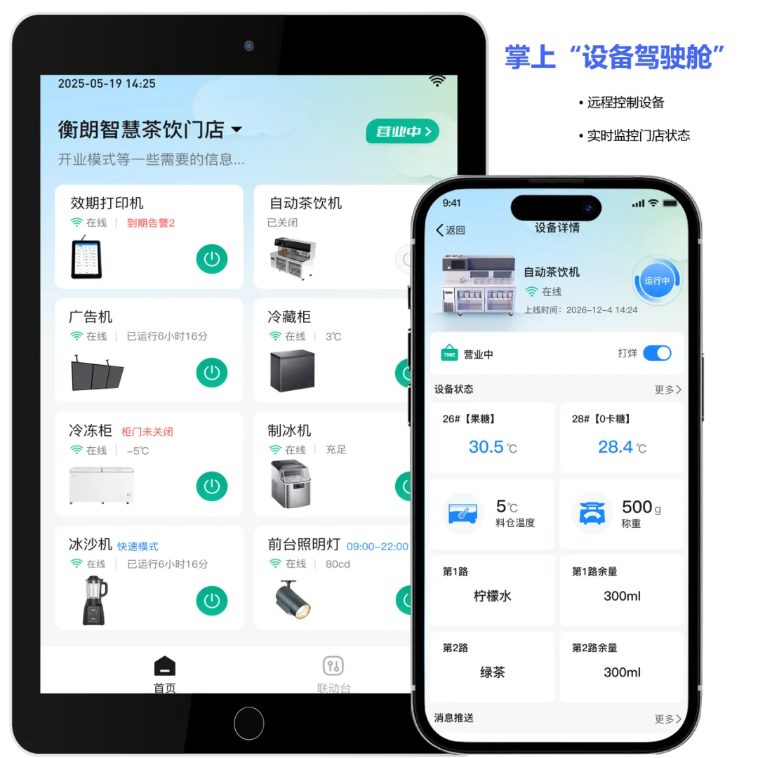 自动茶饮机:3-8 秒快速出杯,出料精度 ±1g/1%,支持多模式出杯;食品级材料 + 管道全链路冷藏筑牢食安防线,自带自动清洗、管路寿命监测功能;云平台远程管控,配方统一下发,大幅降低培训成本与运营损耗,提升出杯标准化。