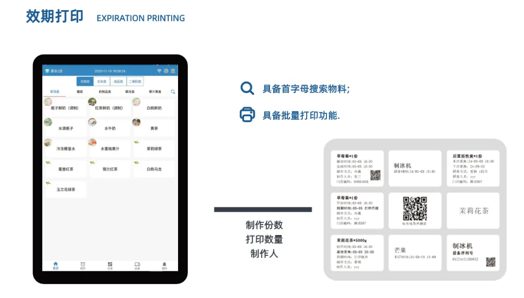 食安效期管理系统:云平台 + 门店终端双端架构,品牌端统一管控全门店物料效期,门店端支持效期标签快速打印、临期 / 到期语音 + 弹窗双重预警;实现物料的全流程监管,支持批量操作与数据统计,减少物料浪费、规避食安风险。