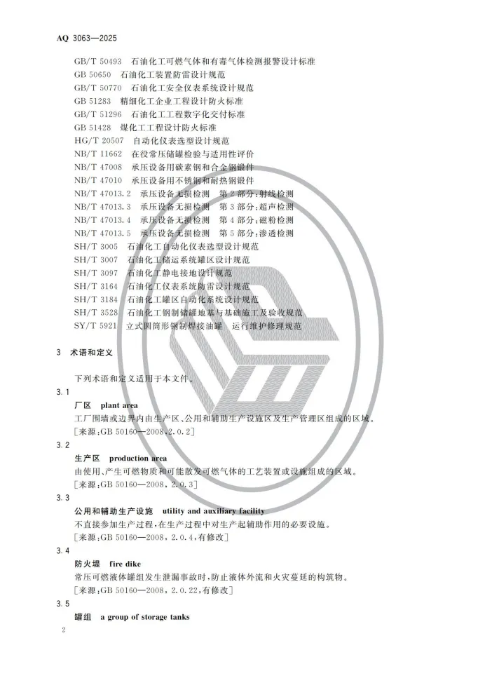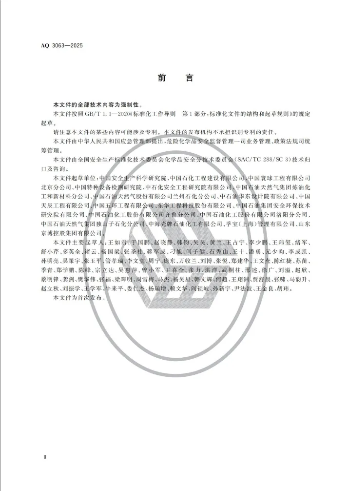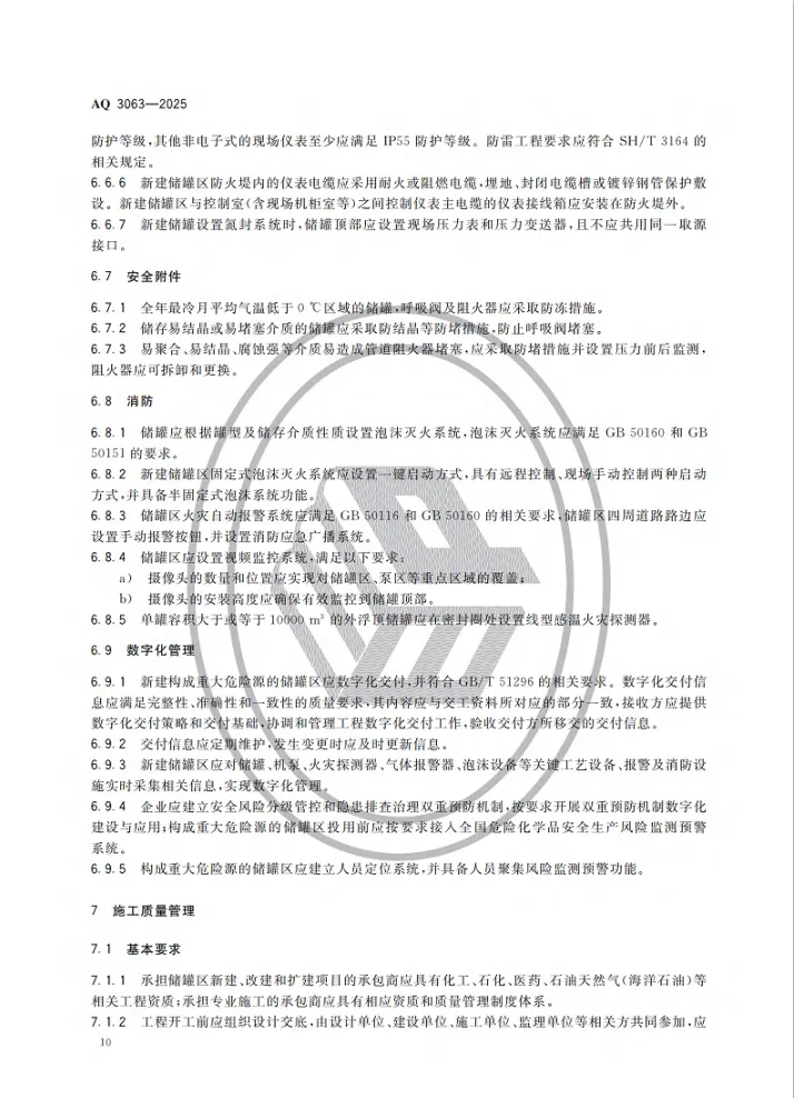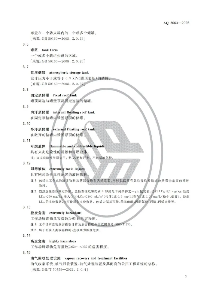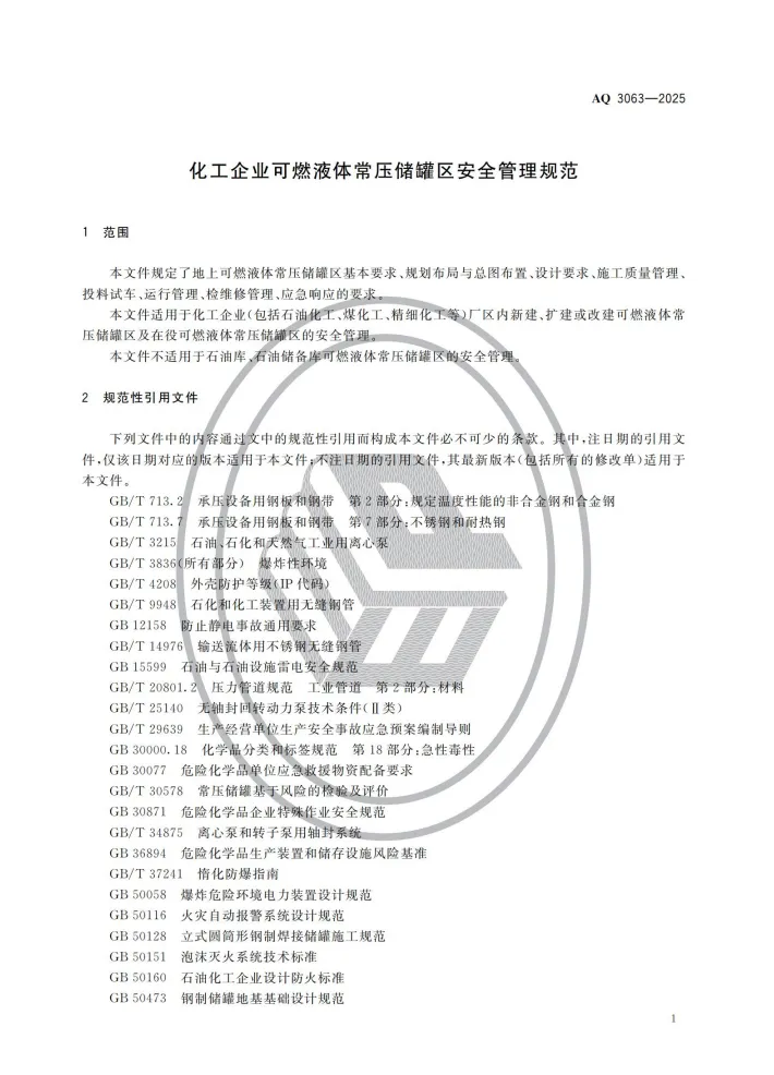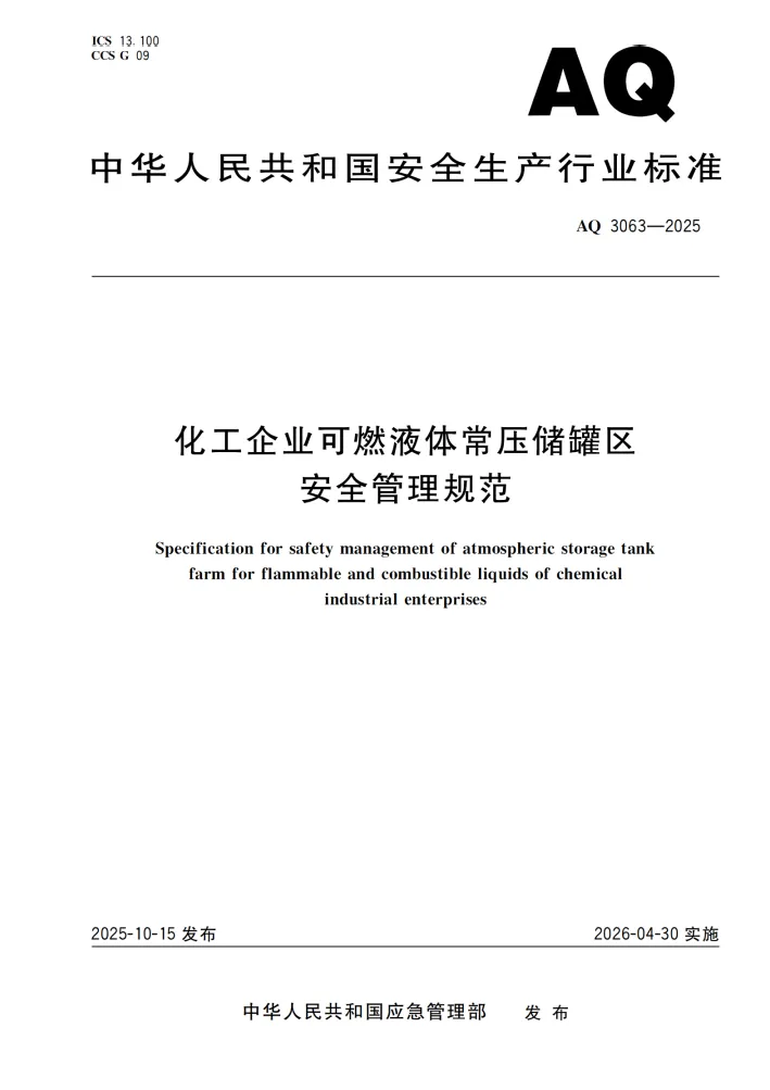 强制性行业标准 AQ 3063-2025《化工企业可燃液体常压储罐区安全管理规范》将于 2026 年 4 月 30 日 正式实施。