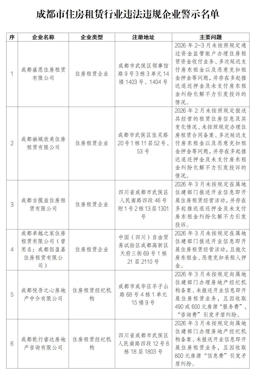 2026年2月至3月期间,成都盛恩住房租赁有限公司(关联企业包括:成都融城欣美住房租赁有限公司、成都吉揽益住房租赁有限公司、成都卓越之家住房租赁有限公司)存在未按规定通过资金监管账户收付租金、多次延迟支付房东租金、恶意克扣租客押金及租金等问题。同时,该公司因多起推迟退还押金、未支付房东租金等纠纷化解不力,引发群众多次投诉。