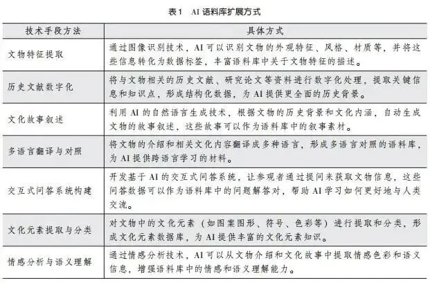 挖掘文化资源可以为“AI+博物馆展览策划”提供灵感和素材。不同文化资源之间的碰撞和融合,可以产生新的创意和想法。AI可以通过对大量文化资源的分析和挖掘,发现其中的潜在联系和创新点,为展览策划带来新的思路和方法。因此,要不断发掘潜在文化资源,利用开发现有文化资源,收集保护民间文化资源,投入到人工智能大语言模型中,丰富人工智能语料库(见表1)。一方面,可以成立文物研究小组,深入挖掘文物背后的故事和历史价值,形成文化素材。例如,通过对一件文物的深入研究,发现其与某个历史事件或人物的独特联系,利用人工智能技术对文物文字数据进行深度学习分析,提取文物特征和文化内涵,形成结构化的文化数据,从而扩展文化语料数据库。另一方面,也要建立博物馆资源共享平台,整合不同博物馆的文物资源和展览经验,为AI提供更广阔的数据分析基础,促进展览策划的创新。