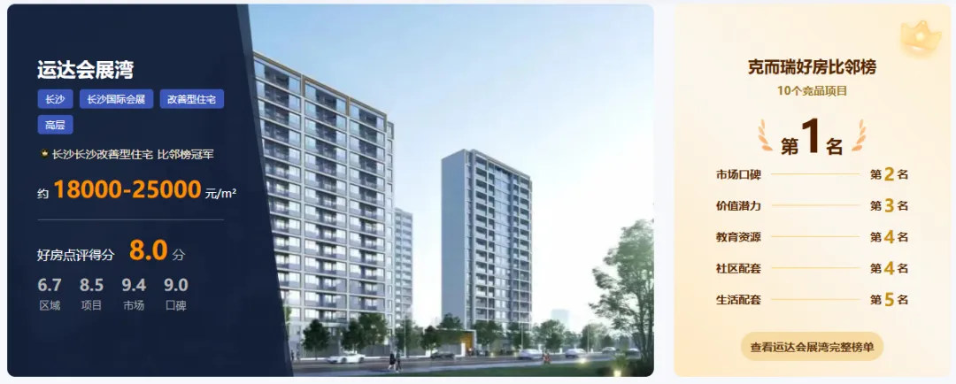 优势概述:根据克而瑞好房点评网测评,运达会展湾的优势覆盖产品、市场、品牌全维度。项目以“高端改善标杆”为核心标签,凭借1.88稀缺低密容积率、国际一线精装品牌、高车位比及运达品牌兑现力,精准匹配高净值家庭对品质生活、圈层价值与资产保值的核心诉求,成为长沙会展板块改善置业的价值标杆。