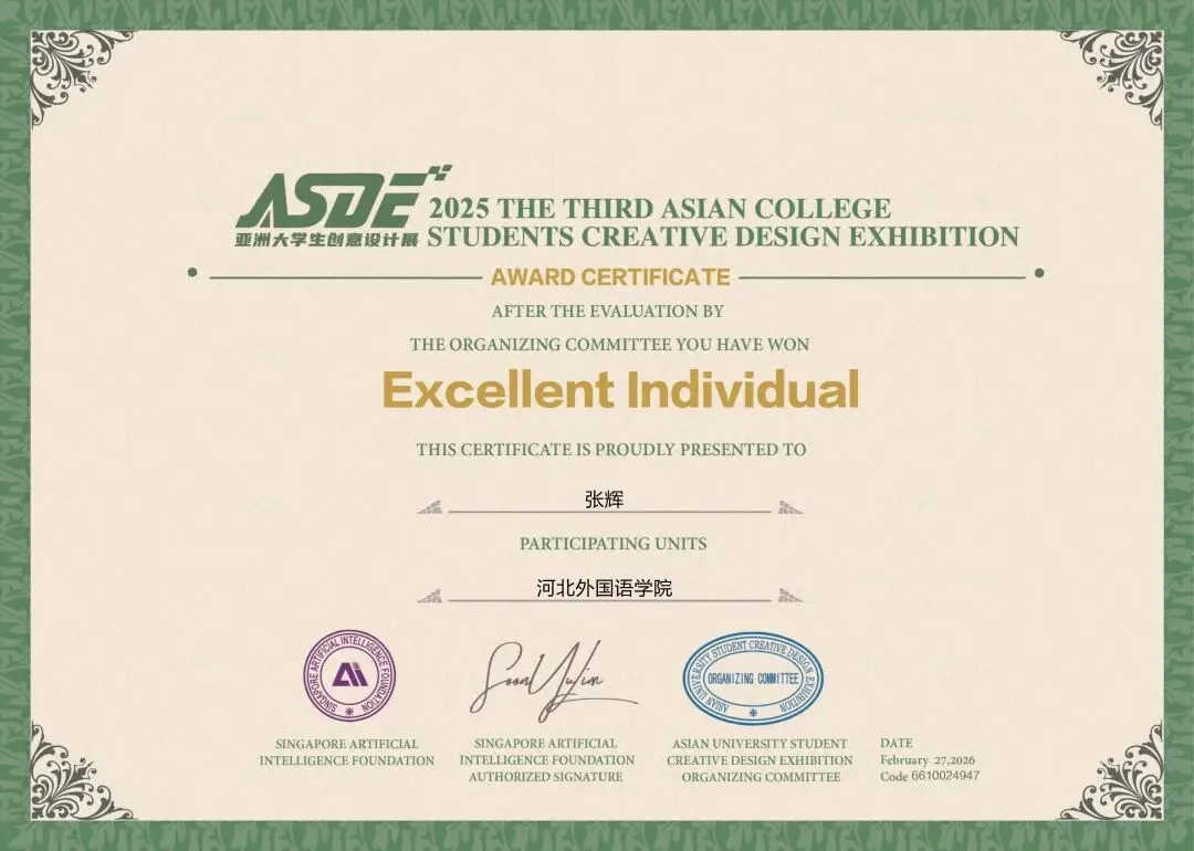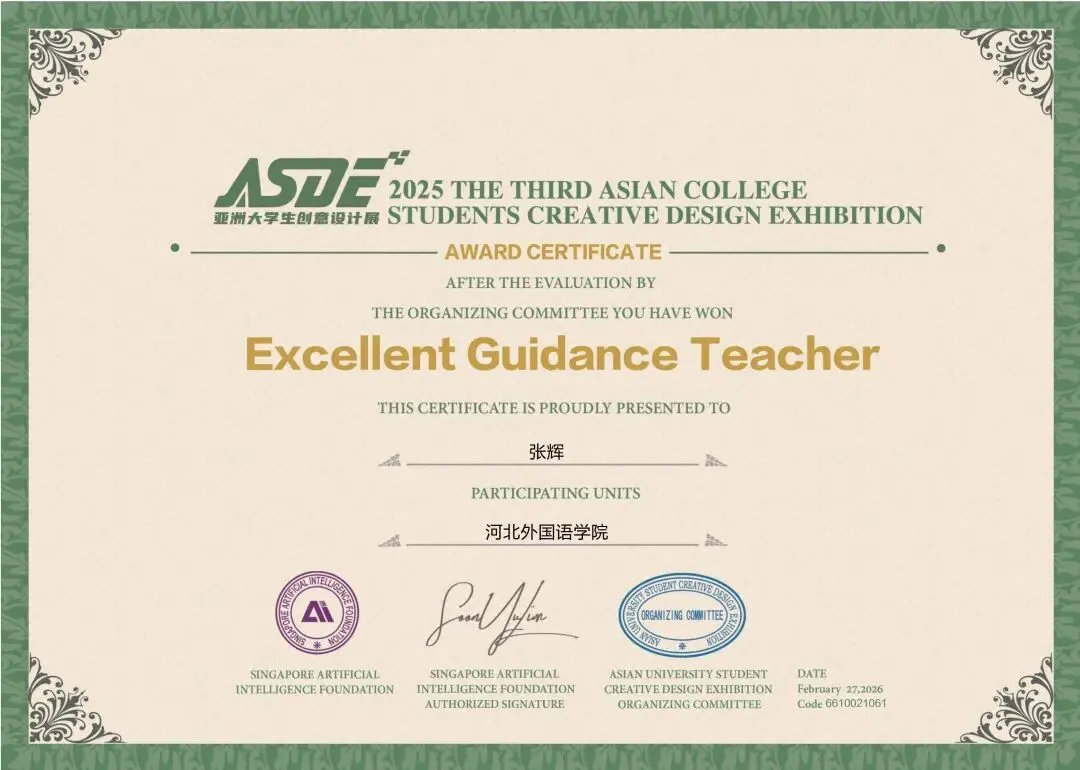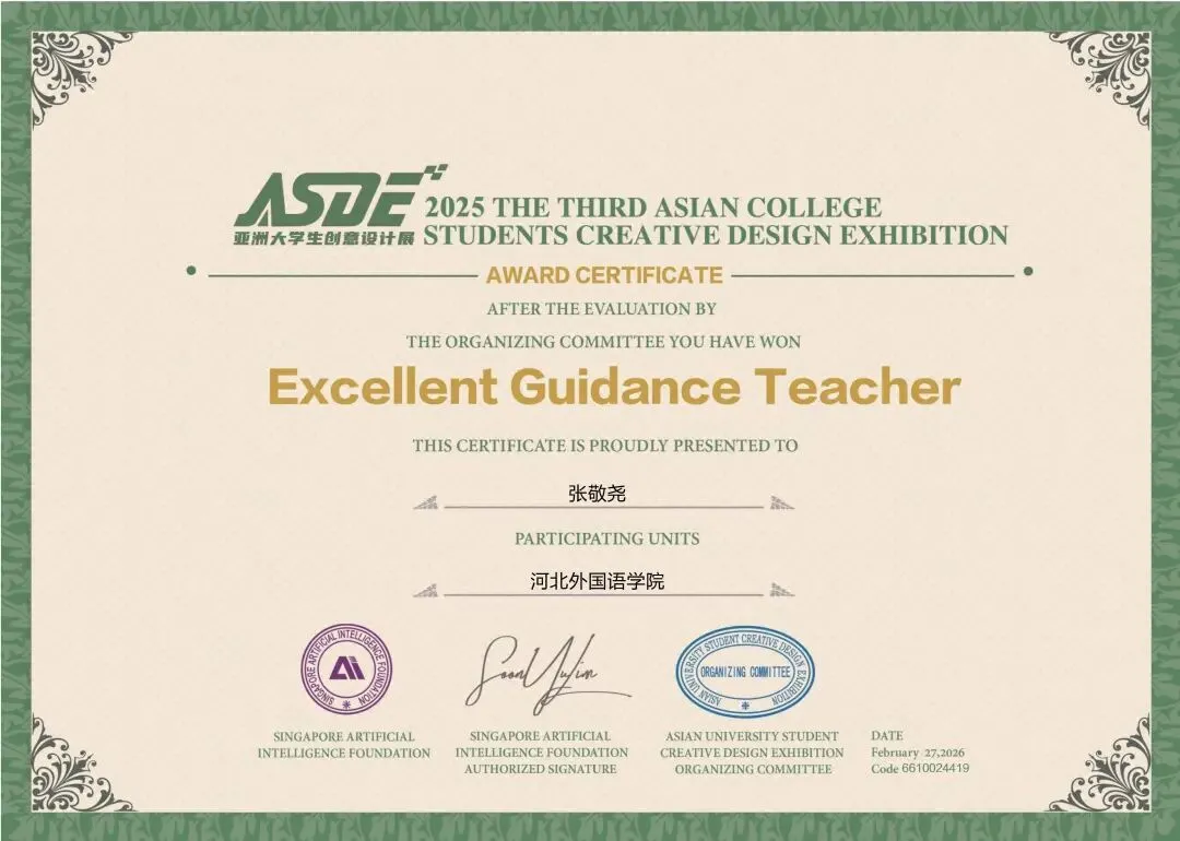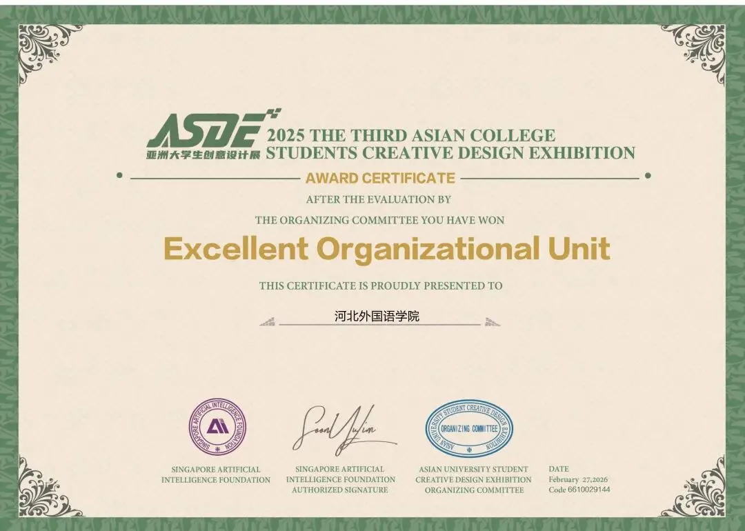 刘菲老师、张敬尧老师、贾丹丹老师、张辉老师、尚志伟老师、赵韦老师、郭子琦老师、焦辰涛老师、李文妲老师共9位老师获得优秀指导教师荣誉,刘菲老师、张辉老师、赵韦老师获得优秀个人奖,河北外国语学院获得优秀组织单位奖荣誉。