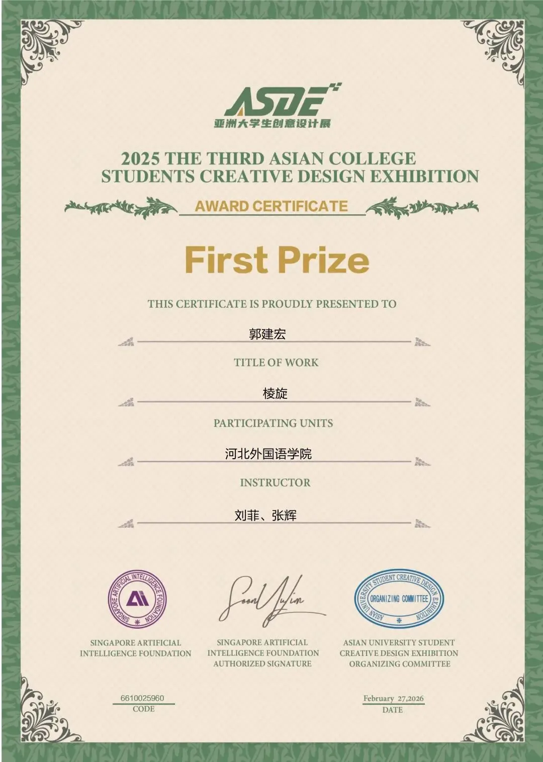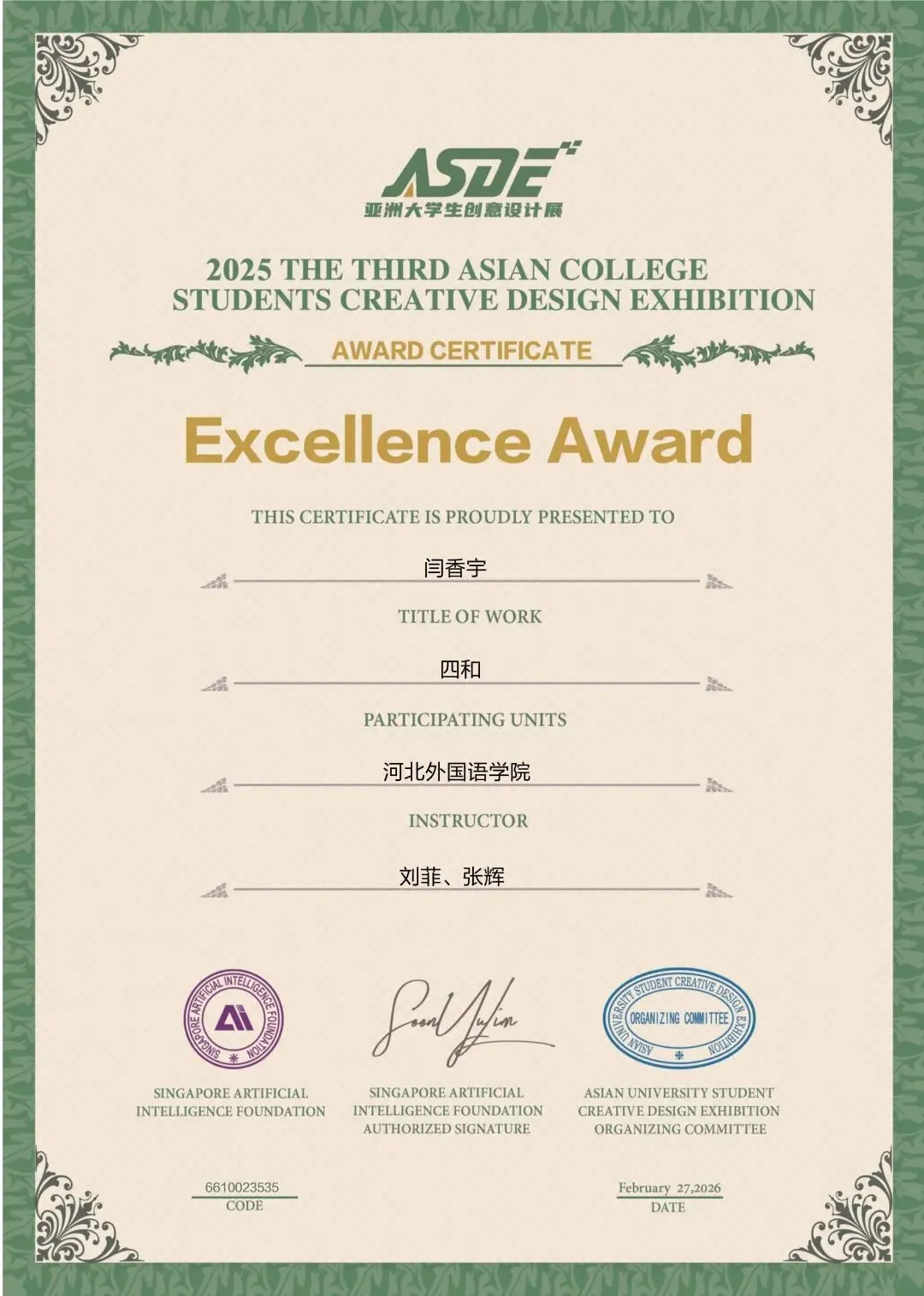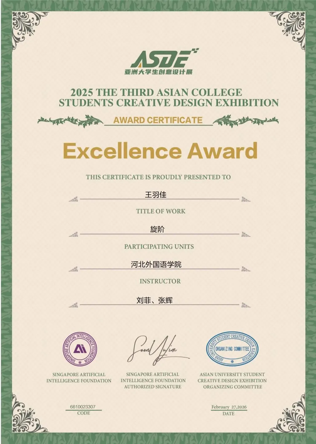 刘菲老师、张敬尧老师、贾丹丹老师、张辉老师、尚志伟老师、赵韦老师、郭子琦老师、焦辰涛老师、李文妲老师共9位老师获得优秀指导教师荣誉,刘菲老师、张辉老师、赵韦老师获得优秀个人奖,河北外国语学院获得优秀组织单位奖荣誉。