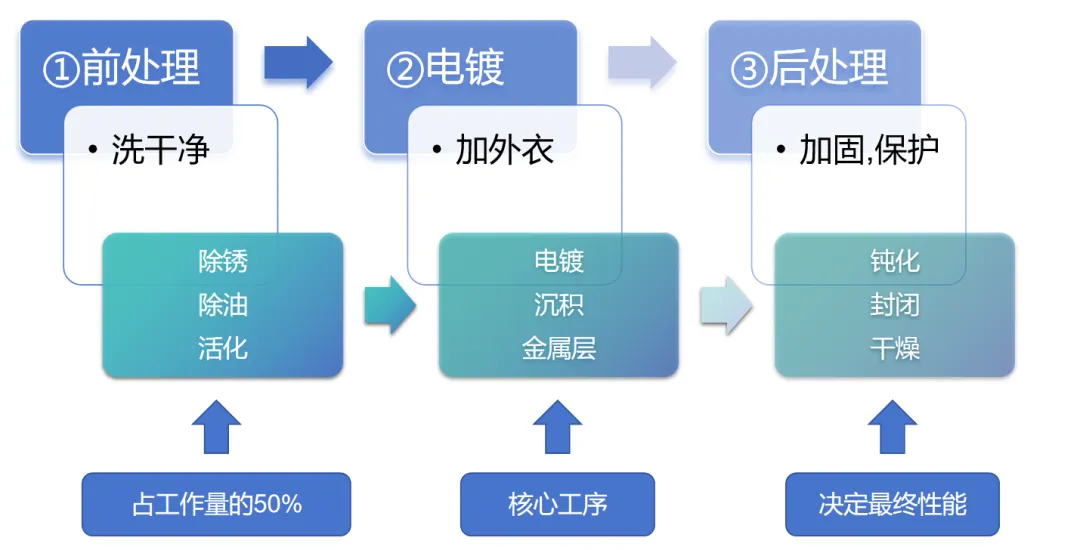 电镀的本质很简单:让金属零件穿上一层其他金属的外衣。整个过程可以分为三个阶段: