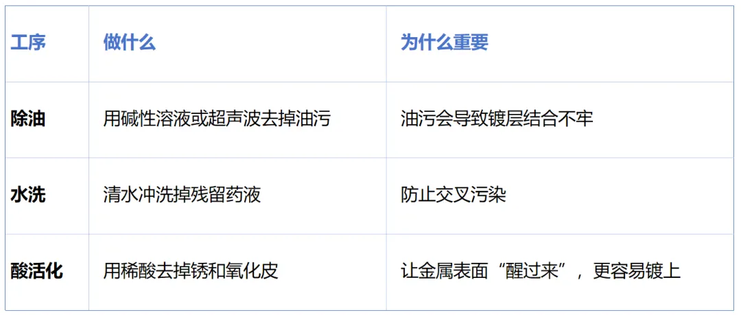 工件进入生产线时,表面有油污、锈迹、氧化皮,这些东西不洗干净,镀层会起皮、脱落。前处理括: