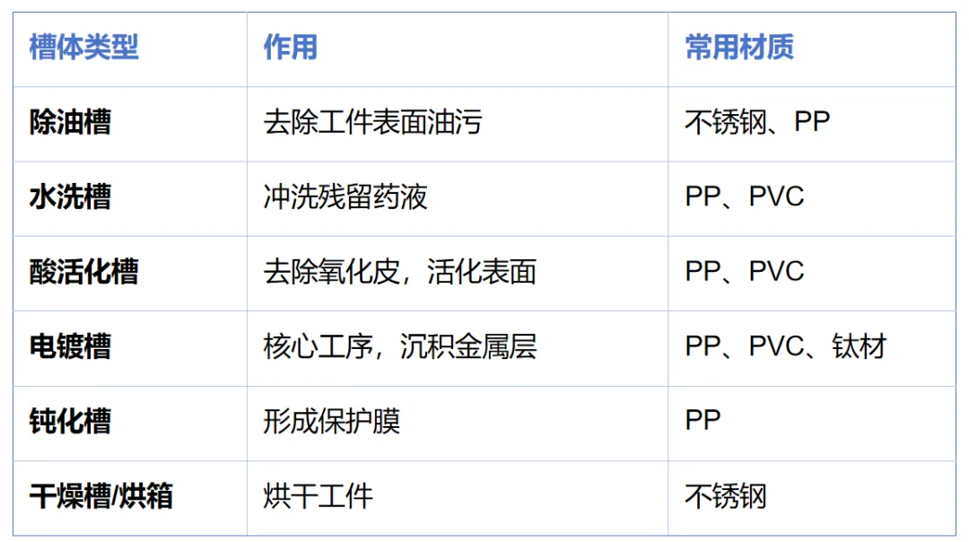 作为机械工程师,设计电镀设备时不需要成为化学专家,但需要理解每个工艺段对设备的要求: