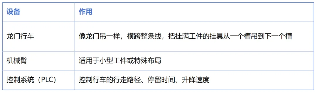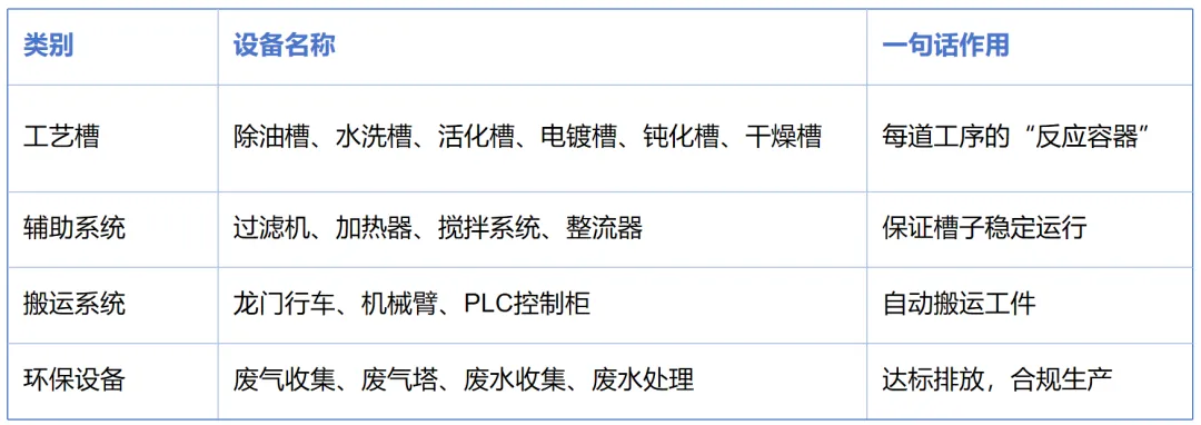 一条自动电镀生产线,可以理解成一排“水池子”加上一个“自动搬运机器人”。我把设备按功能分成四类: