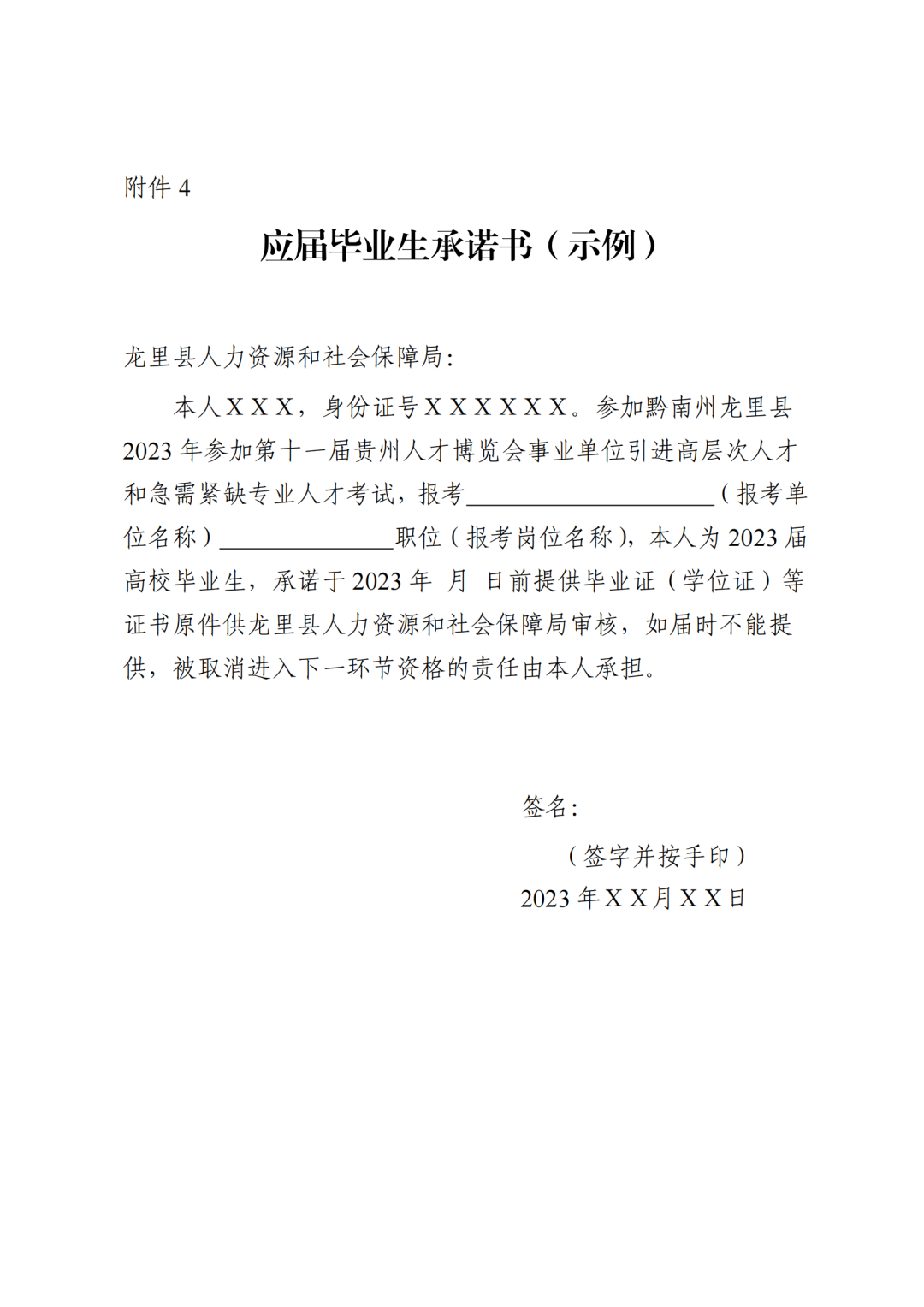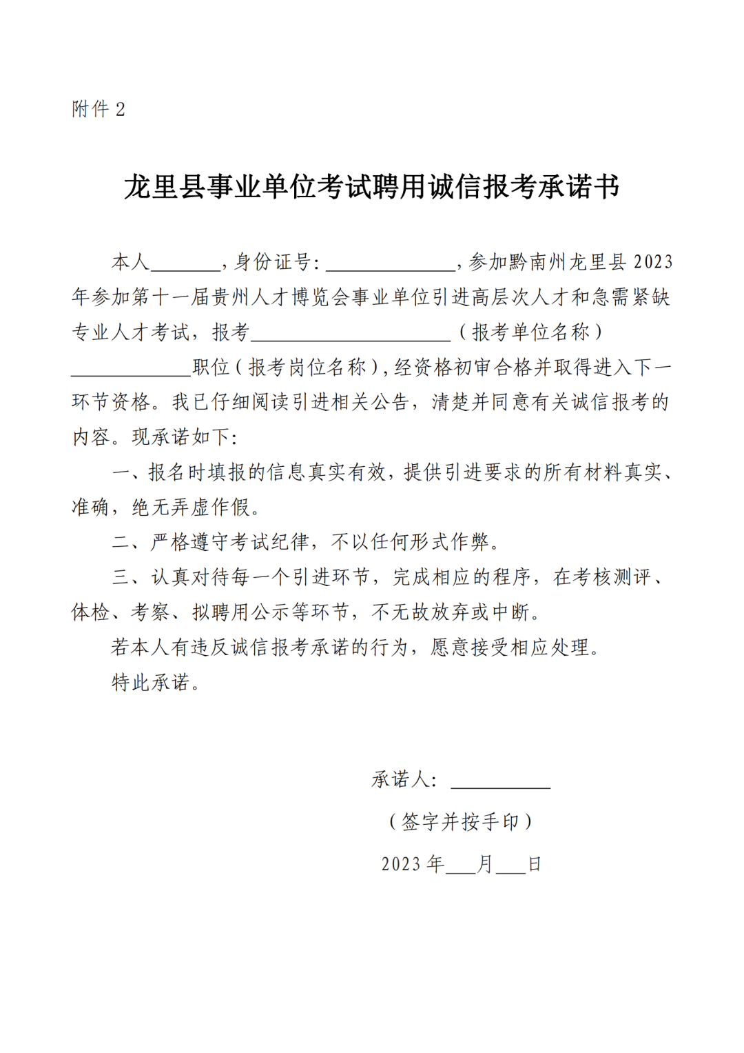 2.龙里县事业单位考试聘用诚信报考承诺书