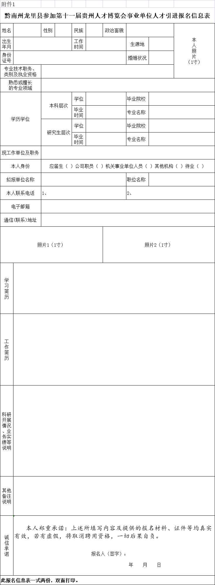 (一)《黔南州龙里县参加第十一届贵州人才博览会事业单位人才引进报名信息表》(附件1)1份(A4纸双面打印)。