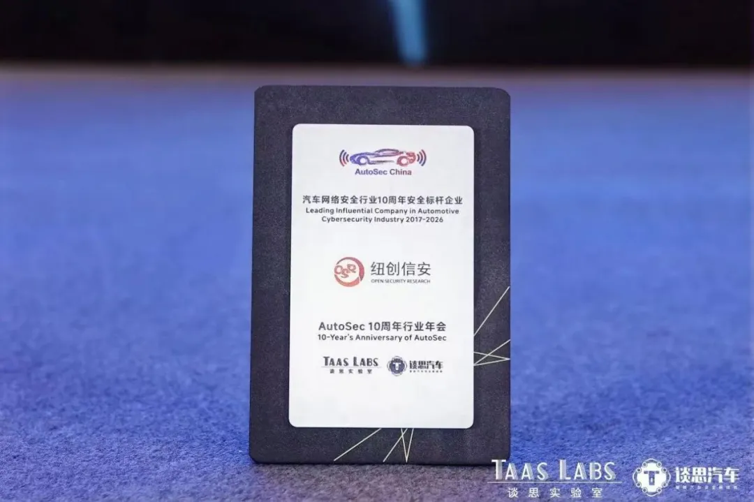 近日,投控东海已投企业深圳市纽创信安科技开发有限公司(简称“纽创信安”)在AutoSec 2026中国汽车网络安全及数据安全合规峰会十周年盛典现场,凭借在汽车网络安全领域的突出贡献与技术创新,获得“汽车网络安全行业10周年安全标杆企业”奖项。