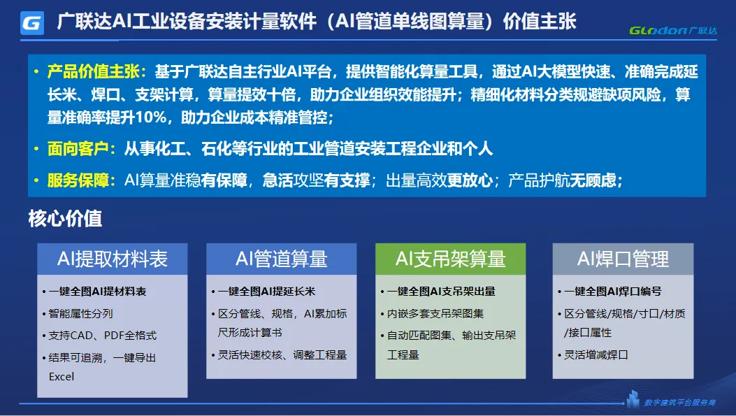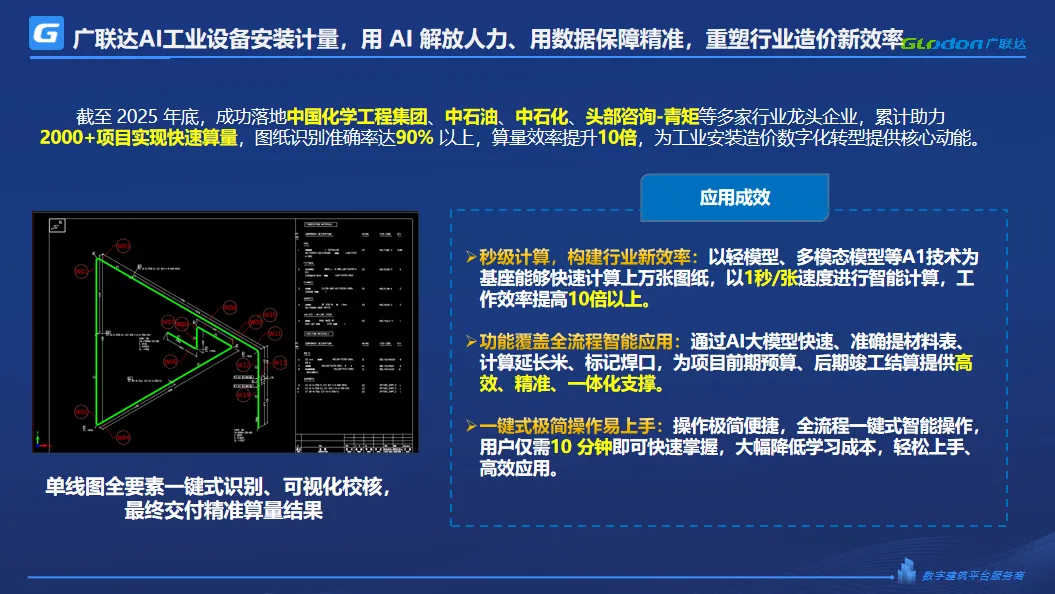 工业安装领域的数字化转型,从来不是单一功能的迭代,而是从效率提升到成本优化、从精准管控到组织效能提升的全维度革新。近日,特邀北京巴吉特工程咨询有限公司业务部门王经理进行了一次深度访谈,通过与标杆客户的访谈与价值验证,广联达AI工业设备安装计量软件凭借实打实的应用成效,交出了一份亮眼的数字化答卷,用技术实力诠释“国产工业软件从‘试用’到‘首选’的破局之路”,成为助力企业降本增效、提升核心竞争力的关键引擎。真实场景的检验,是软件价值的最好证明。本次访谈中,北京巴吉特工程咨询有限公司结合3-4个实际项目(含福建古雷纯管廊专业概算15亿级项目、中石化催化剂(天津)有限公司聚烯烃弹性体催化剂工业试验装置工程施工及多个2亿级项目)的应用实践,量化验证了软件的核心价值——彻底打破传统人工统计的效率瓶颈,实现从“人工低效”到“智能高效”的跨越式升级。传统模式下,人工统计单线图效率仅为150张/人/天,不仅耗时费力,更易出现材料缺项漏项、管件分类模糊等问题,直接影响预算编制与材料核销的准确性。而使用广联达AI工业设备安装计量软件后,支持批量导入图纸,通过智能识别AI技术解析提取单线图材料表、管段图,秒级计算,单线图统计效率跃升至550-600张/人/天,效率提升约3.7倍,真正实现“高效不打折、精准不缺位”。通过AI大模型,凭借精细化的图纸识别能力,可精准区分弯头、大小头等各类管件,智能识别后管道及管件均自动列项,在此基础上,可以切换到单线图图纸中,点选管道cad线,软件自动找出完整管道回路、并自动得出管道的计算式以及延长米计算结果,输出一套涵盖管道的延长米及净长、管件、阀门、法兰等附件工程量的材料明细表。效率提升5倍以上,延长米反查结果清晰可溯源。从源头解决人工统计的疏漏问题,大幅提升材料核销的精准度,完全规避材料缺项漏项,为后续的材料成本管控提供了强有力的支撑。①点选管道cad线,自动查找完整管道回路、计算管道延长米适配审核业务场景,针对复杂图纸、问题图纸的快速对量需求,无需全量识别即可完成比对,通过软件快速识别复杂问题图纸,与对方底稿进行对比,将原本3-4个月的审核周期大幅缩短,让审核工作更高效、更精准。正如行业实践所示,优质工业软件的核心价值,在于将工作人员从繁琐的重复性劳动中解放出来,聚焦更具价值的核心工作,实现人力价值最大化。在工业安装项目中,成本管控是企业核心诉求,而我们的软件始终以“务实高效、价值对冲”为核心,平衡显性成本与隐性收益,实现企业与软件的双向共赢。访谈中,北京巴吉特工程咨询有限公司的业务部门王经理尤其非常认可软件在人力成本节约上的显著优势:通过软件替代人工,原本5-6人的统计团队可缩减至1-2人识别+1人核对,剩余的人员间接节约大量人力成本,提升企业组织效能适配更高价值业务,实现“显性支出有对冲,长期收益更可观”。这种“精准控本、高效提效”的价值逻辑,正是工业软件数字化转型的核心意义所在——不追求“表面便捷”,而是深度贴合行业痛点,让每一笔投入都能转化为实实在在的效益,助力企业在激烈的市场竞争中实现成本优势突围,这也与当前企业数字化转型“追求高投资回报率、务实适配需求”的核心诉求高度契合。好的工业软件,从来不是“实验室的盆景”,而是“产线上的重器”,需在真实场景中不断淬炼、迭代升级。本次访谈中,北京巴吉特工程咨询有限公司的业务部门王经理对于软件目前所提供的服务非常满意,产品团队不仅全线支撑日常问题处理,对于日常需求的实现以半月为周期,一月一发版为迭代,AI大模型快速支撑了客户多样化图纸的识别问题。并按季度在材料表识别、延长米计算的基础上,更新增加了焊口识别、支架计算的功能优化,在用户只是想快速进行支架数个数的诉求下,可实现根据单线图快速计算行标支架工程量,1000条数据秒级出量,极大超出期望,为后续的更多适配场景提供了支撑。从15亿级重点项目到常态化中小型项目,从效率提升到成本优化,从功能适配到场景拓展,本次标杆客户访谈不仅验证了我们工业安装软件的核心价值,更奠定了双方深度合作、共生共赢的基础。作为工业安装领域数字化转型的践行者,我们始终坚持“以实践验价值,以迭代促提升”,依托真实项目场景打磨产品,凭借快速响应的服务与深度适配的功能,助力更多企业实现数字化升级。未来,我们将以本次标杆合作为契机,吸纳客户宝贵建议,持续优化产品功能、提升服务品质,持续完善核心功能,优化性能体验,让软件更贴合行业需求、更适配实际场景。同时,我们将收集标杆项目案例素材,以真实成效赋能更多同行,让数字化力量渗透工业安装全流程,助力行业告别低效粗放,迈向精准高效、智能便捷的数字化新未来!北京巴吉特工程咨询有限公司成立于 2000 年 10 月,是一家具有工程造价咨询甲级资质的有限责任公司。主要从事工业项目、民用建筑工程,特别是石油化工、煤化工、天然气化工行业中的固定资产投资项目及技术改造项目;生产装置的检修、日常维修项目的造价咨询服务工作。 成立以来,与国内多家客户,特别是中国石化集团有限公司、中化泉州石化有限公司、中国神华集团有限公司、福建中沙石化有限公司等单位有着良