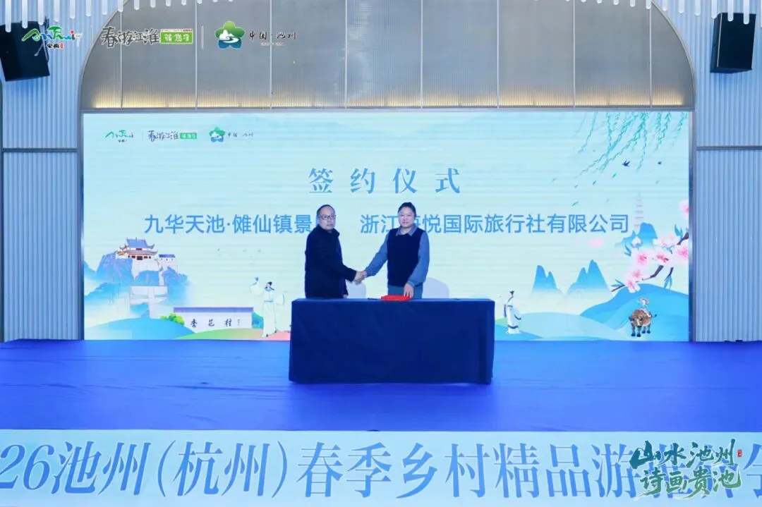 推介会核心环节——签约仪式取得丰硕成果。池州市贵池区九华天池景区与杭州重点旅行社代表现场签署战略合作协议,标志着两地在客源互送、资源共享、市场共建等领域迈入更深层次的合作阶段。