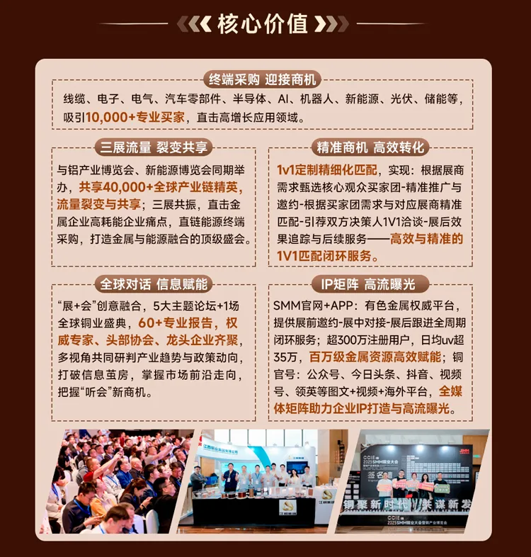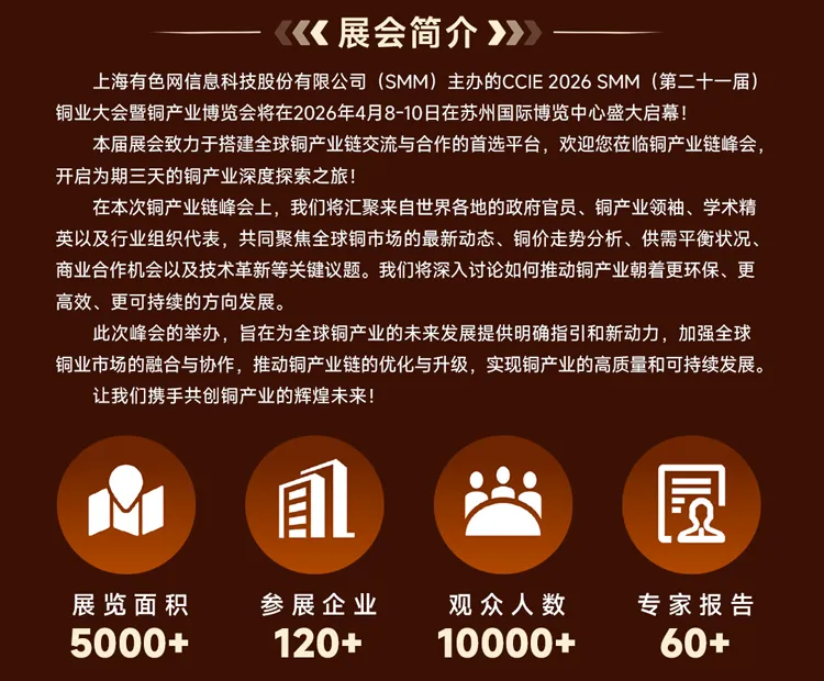 上海有色网信息科技股份有限公司(SMM)主办的CCIE 2026 SMM(第二十一届)铜业大会暨铜产业博览会将在2026年4月8-10日在苏州国际博览中心盛大启幕!
