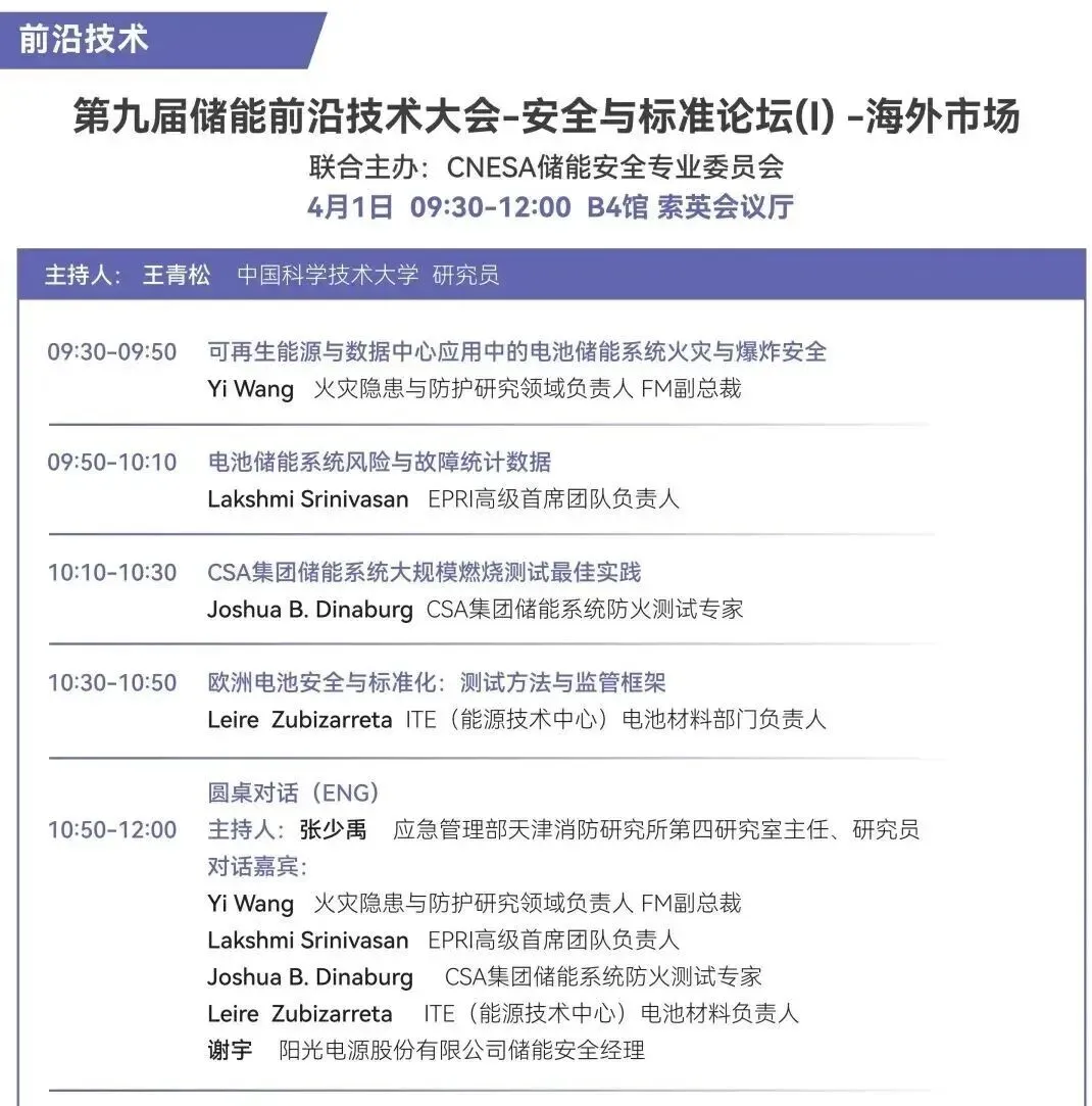 本次展览会将同步举行40+场主题分论坛,CSA集团的储能火灾安全专家Joshua B. Dinaburg先生受到主办方特别邀请,将于4月1日上午10:10-10:30在主题论坛《安全与标准专场——海外市场》中带来《CSA储能系统大规模火灾测试最佳实践探讨》,并会在10:50-12:00的圆桌对话环节中与现场嘉宾展开关于储能安全、技术创新和标准协同等方面的深度探讨,届时将与全场观众深度研判储能标准体系,为行业安全构建全球视野解决方案。