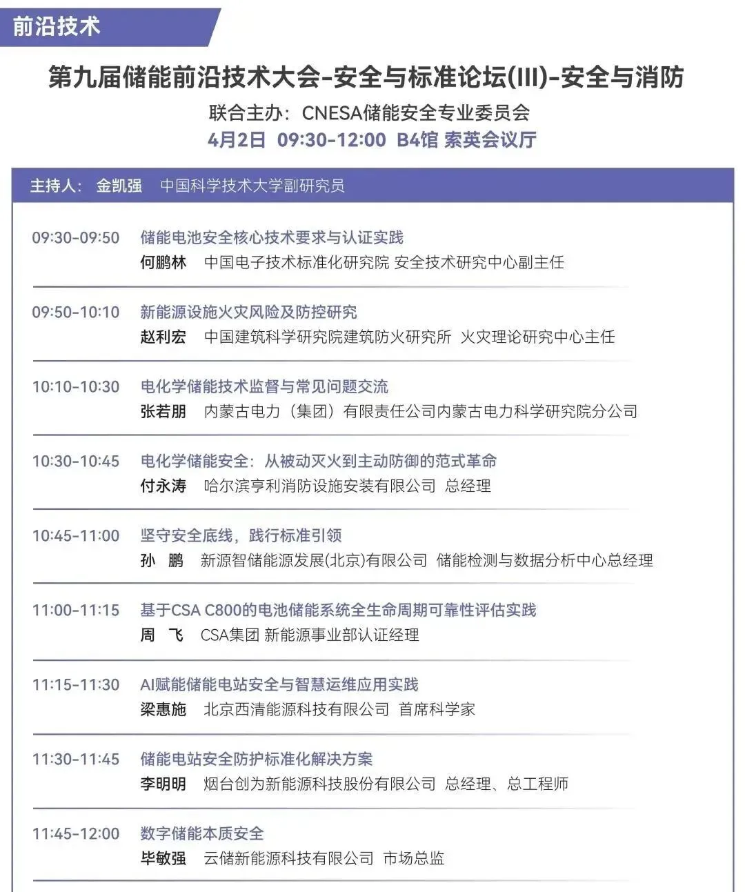 另外CSA集团储能事业部经理周飞先生也将会参与4月2日的主题论坛《安全与标准专场——安全与消防》,将于上午11:00-11:15带来《基于CSA C800的电池储能系统全生命周期可靠性评估实践》方面的分享。