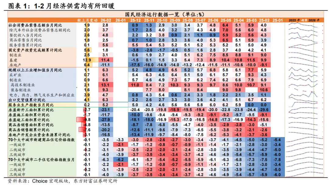 整体来看,2026年经济良好开局。供给端保持增长,工业增加值同比高于去年12月。需求端持续向好,社零同比增长较快,服务消费表现强势;投资由负转正,地产降幅收窄;出口大幅回升,外需韧性仍强。