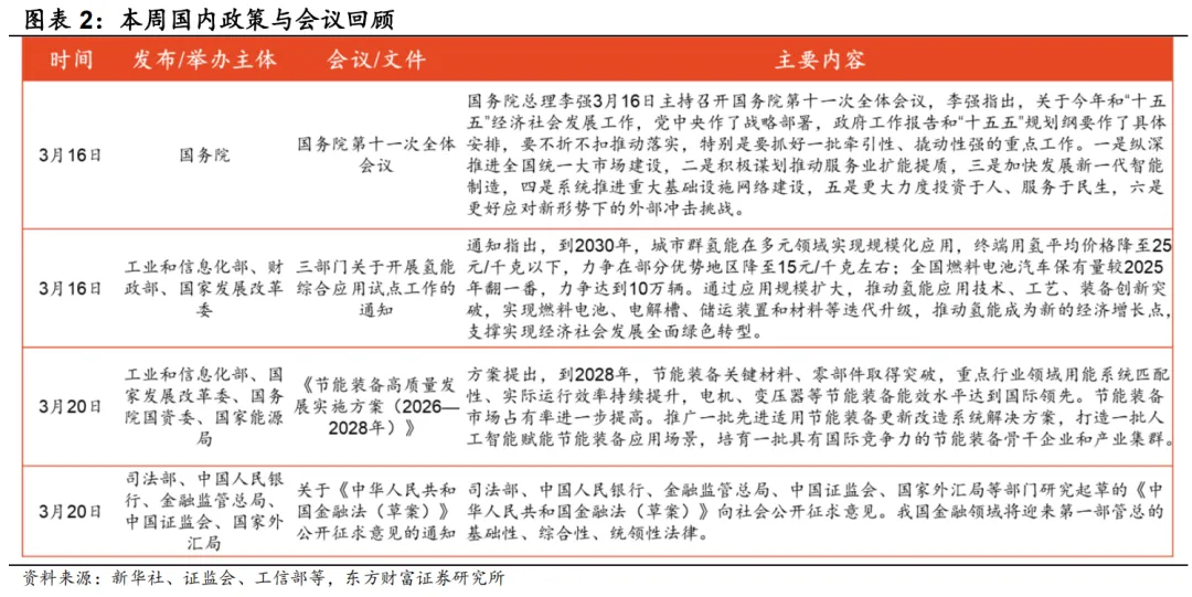 本周政策及会议在产业政策方面,工信部等三部门将启动氢能综合应用试点,提出到2030年,全国燃料电池汽车保有量较2025年翻一番,力争达到10万辆。此外,四部门发布《节能装备高质量发展实施方案(2026—2028年)》,提出到2028年,电机、变压器等节能装备能效水平达到国际领先。节能装备市场占有率进一步提高。在金融法治方面,司法部、金融监管总局、中国证监会等部门研究起草的《中华人民共和国金融法(草案)》向社会公开征求意见。我国金融领域将迎来第一部管总的基础性、综合性、统领性法律。