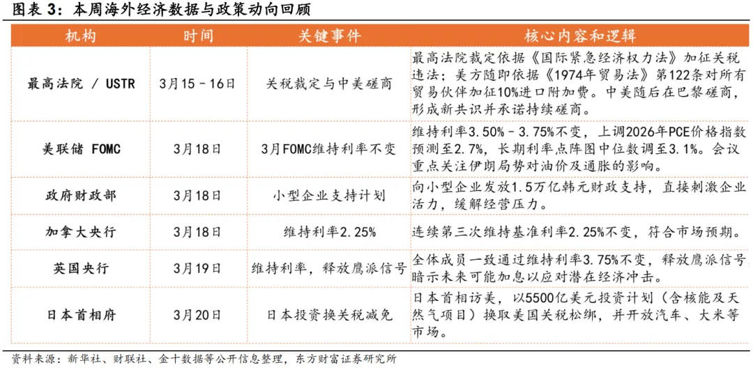 货币政策方面,美联储3月FOMC会议维持利率3.50%–3.75%不变,但上调2026年PCE价格指数预测至2.7%,会议重点关注伊朗局势对油价的传导影响。