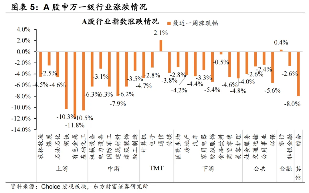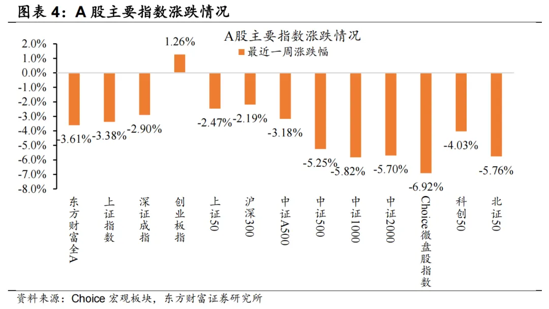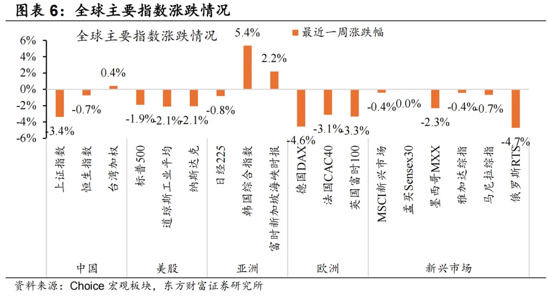 · 海外市场:欧美市场多数回落,亚太股市表现分化。欧洲市场表现较弱,德国DAX领跌(-4.6%),英国富时100与法国CAC40跌幅均超3%。美股三大指数集体收跌,其中道琼斯工业指数下跌-2.1%,标普500与纳斯达克分别下跌-1.9%和-2.1%。亚太市场走势分化,韩国综合指数表现最为亮眼,单周大涨+5.36%;日经225和港股恒生指数则分别回落-0.83%和-0.74%。