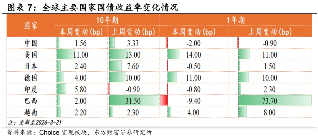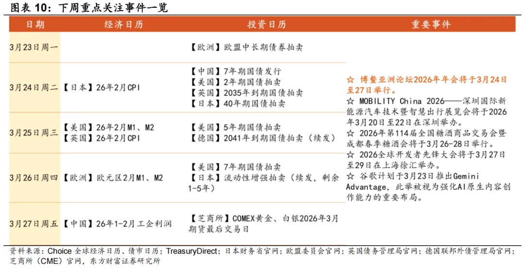 海外方面,大宗商品表现有所分化。油价在高位波动加大,但上冲动能较上周下降;天然气在卡塔尔LNG供给设施遭袭击且修复时间可能长达数年的影响下,冲高动能十分强劲;黄金一反避险逻辑、大幅下跌,降息预期收窄引发流动性担忧以及风险资产普跌背景下卖金补保证金可能是主要影响。权益资产方面,欧美股市较上周承压有所加大,亚洲股市冲高回落,周度表现分化,韩国股市在存储股拉动下相对占优。债券资产方面,受美联储3月议息会议后降息预期收窄影响,美债收益率普遍上行,短端美债收益率上行更加明显。汇率方面,美元指数在上周冲破100后,本周动能走缓、小幅下跌。